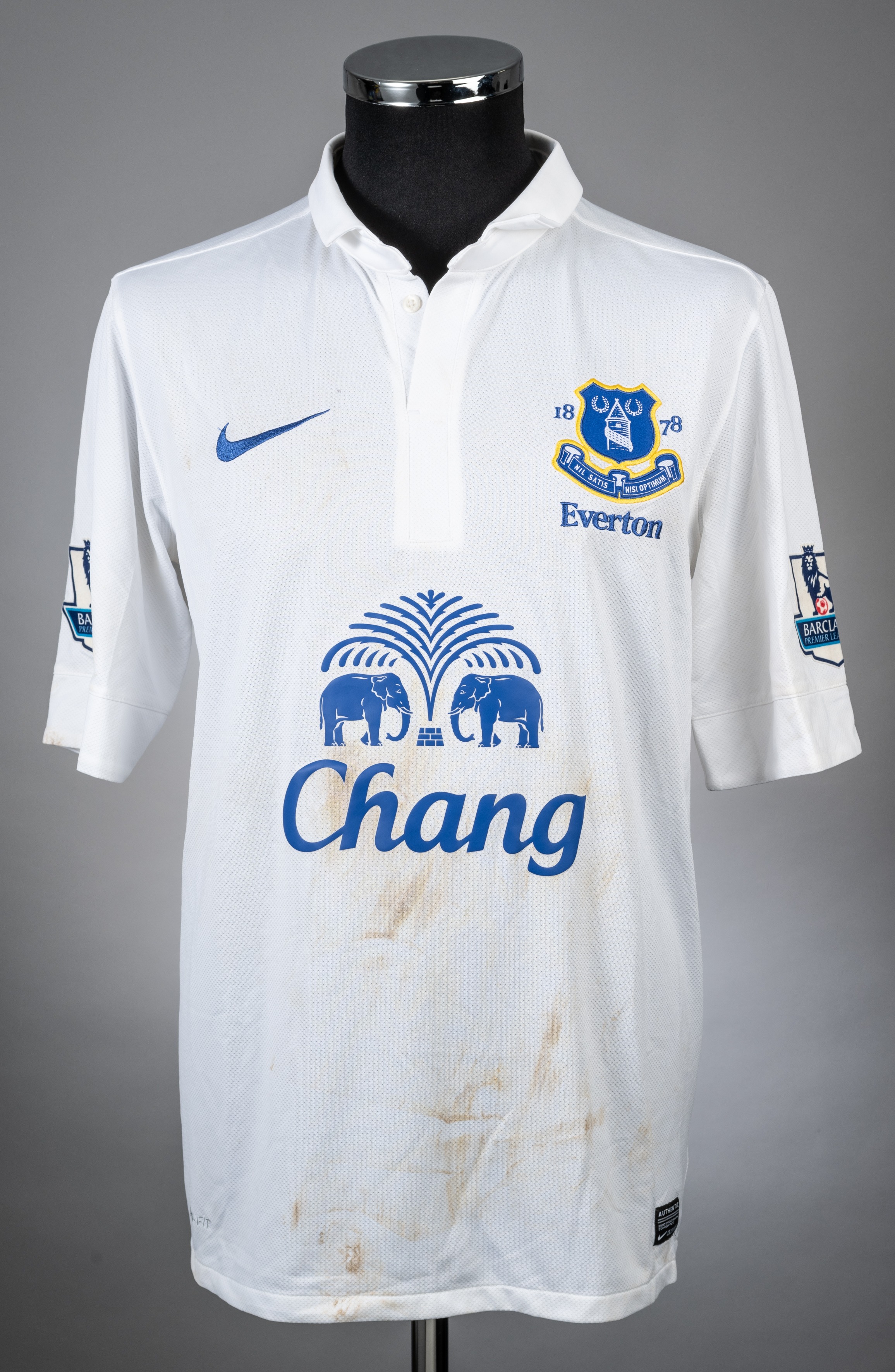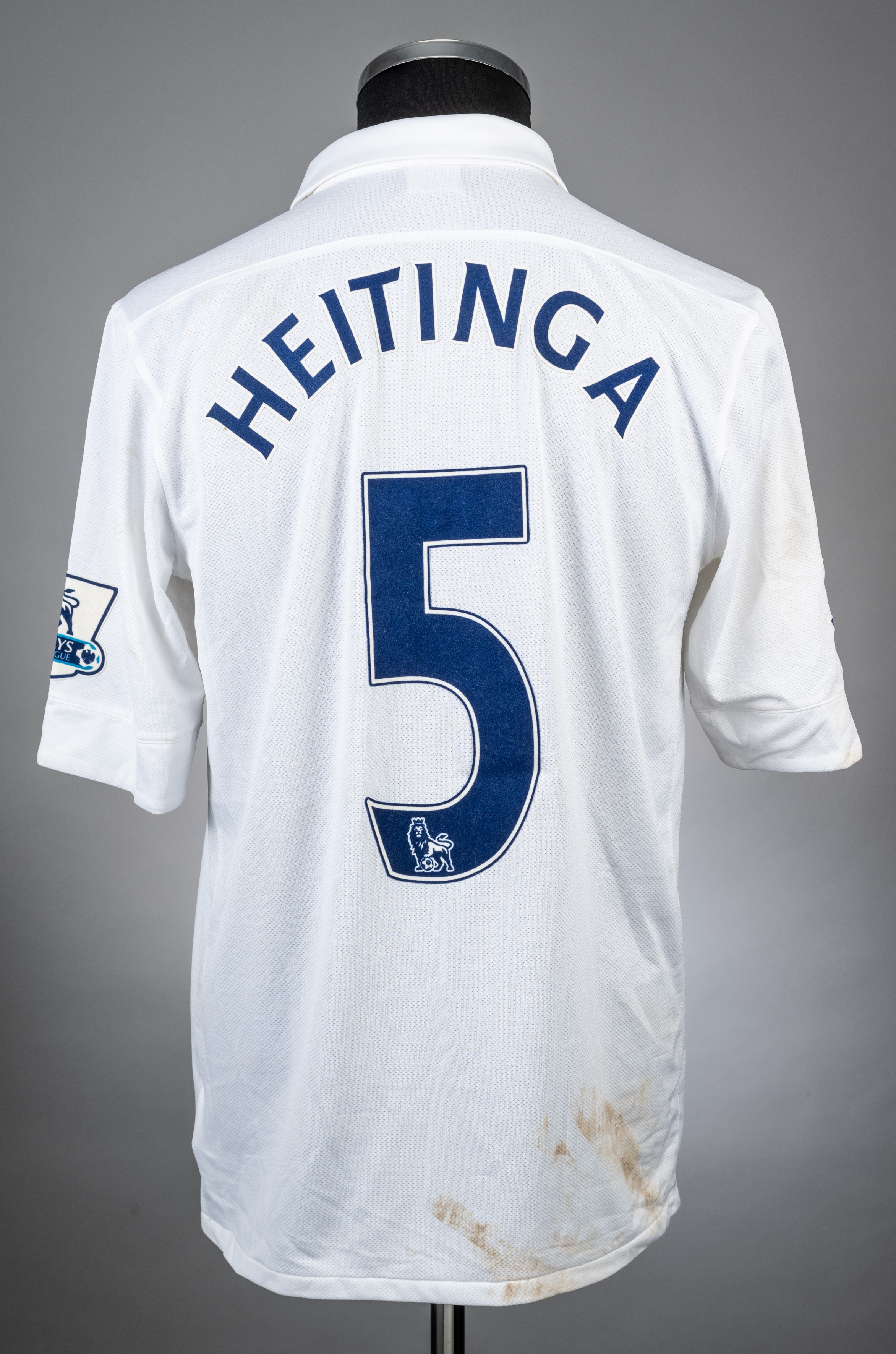 John Heitinga white No.5 Everton match worn short-sleeved jersey, 2012-13, Nike, M, with button-up collar and embroidered badge inscribed 1878 NIL SATIS NISI OPTIMUM EVERTON, the reverse lettered HEITINGA, the sleeves with Barclays Premier League flashes Areas of pitch staining