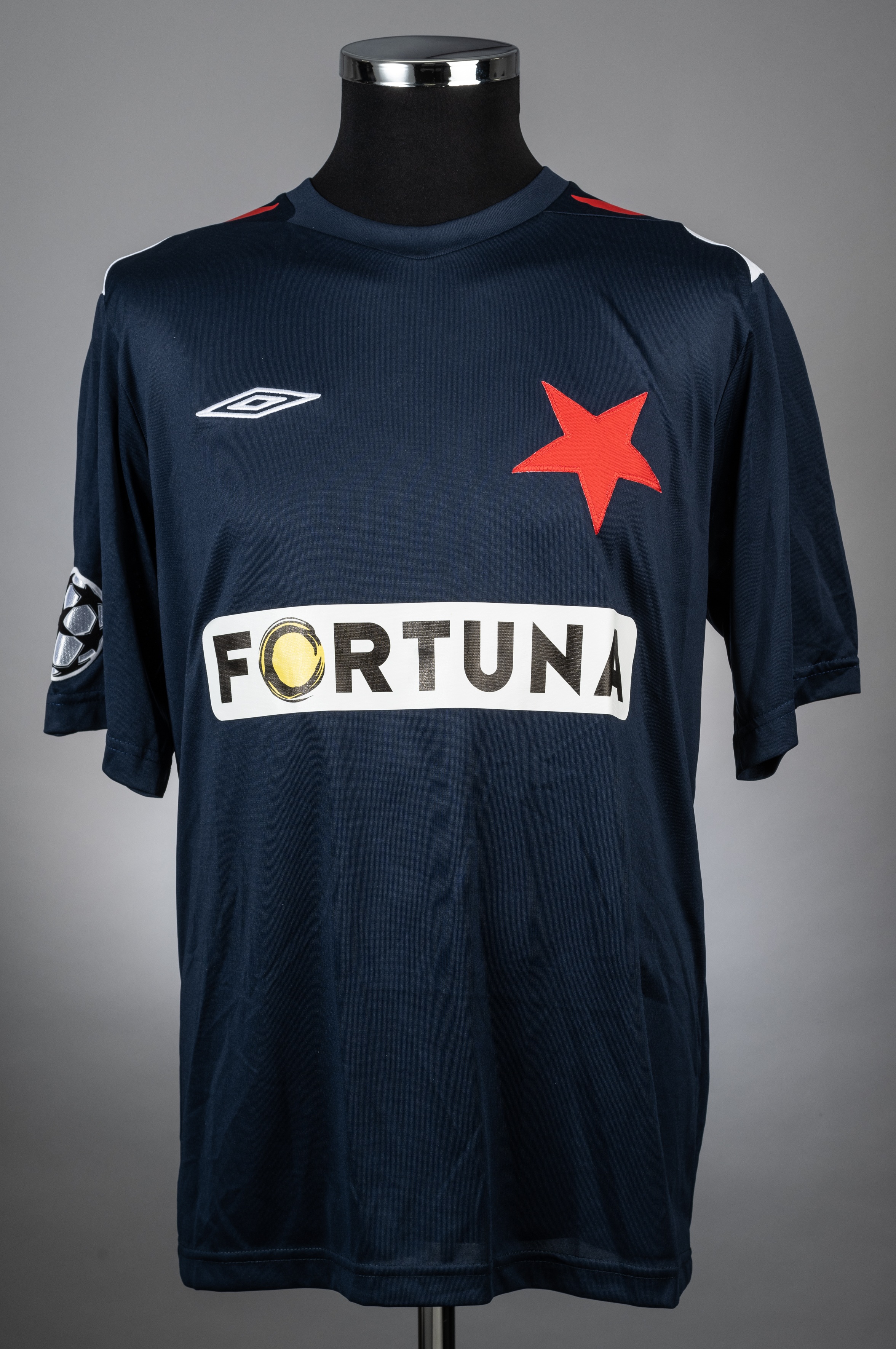 Stanislav Vleck blue and red No.7 Slavia Prague v. Arsenal Champions League match worn short-sleeved jersey, 2007-08, Umbro, L, with crew-neck collar