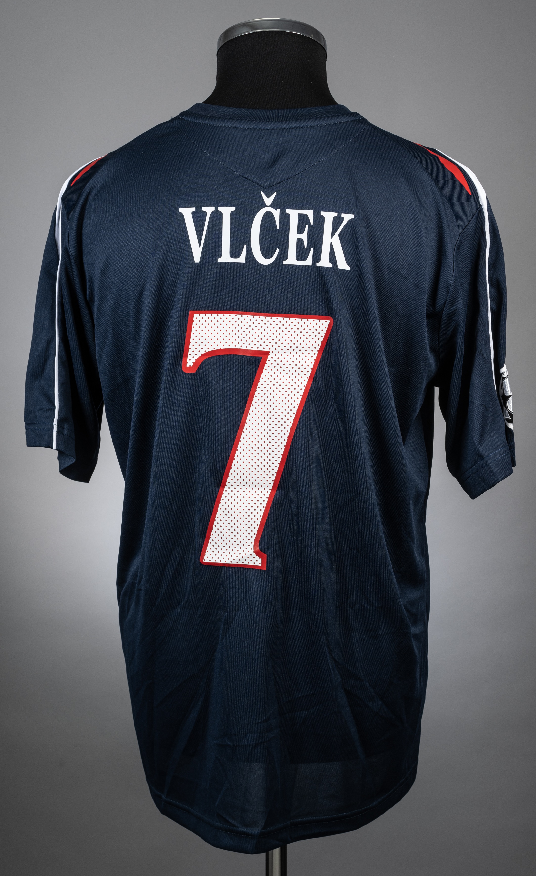 Stanislav Vleck blue and red No.7 Slavia Prague v. Arsenal Champions League match worn short-sleeved jersey, 2007-08, Umbro, L, with crew-neck collar and embroidered badge, the reverse lettered VLCEK, the right sleeve with Champions League flash The jersey was worn by Stanislav Vleck in the Champions League match against Arsenal played on 23rd October 2007, Arsenal winning 7-0