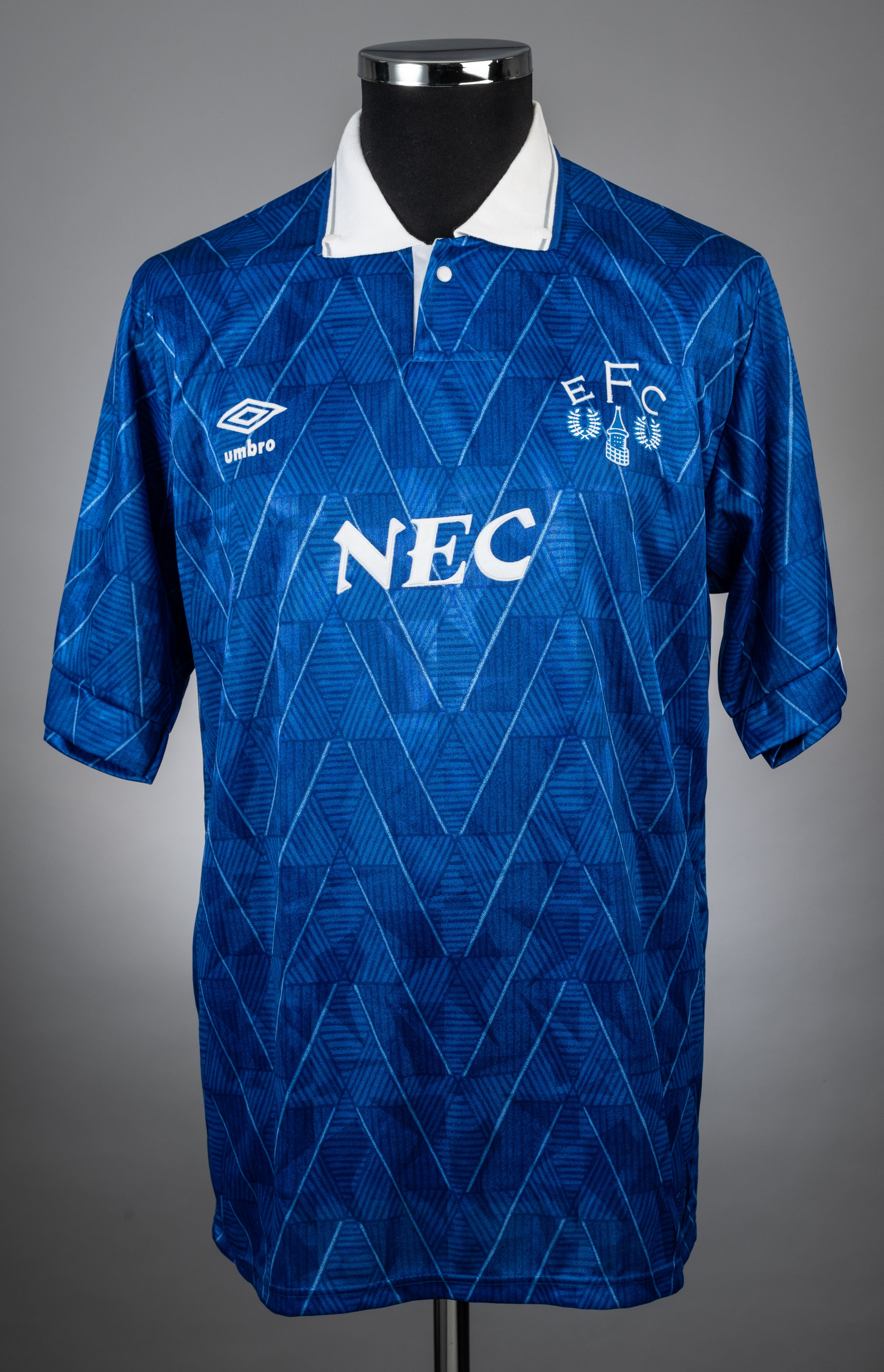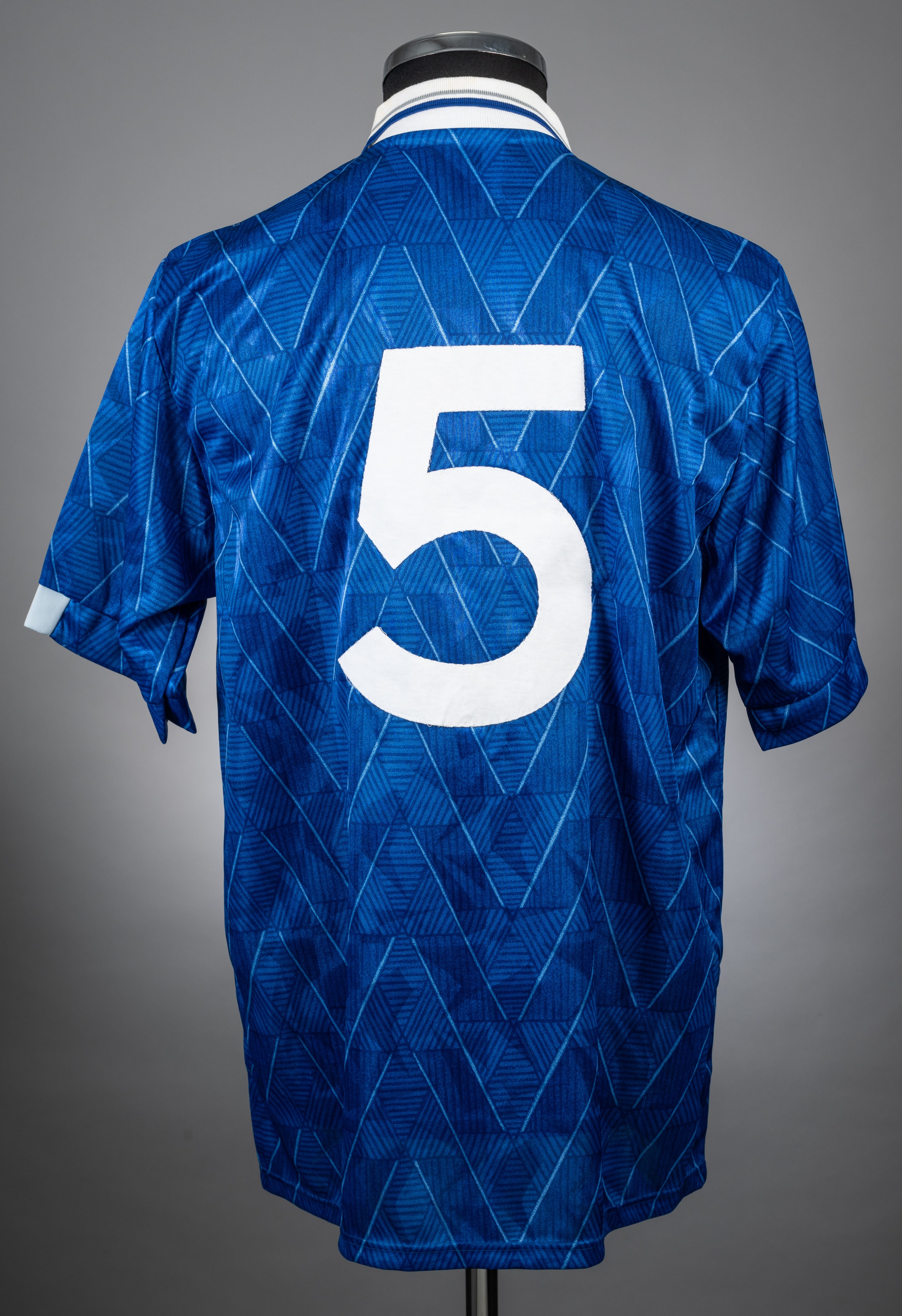 Dave Watson blue and white Everton No.5 short-sleeved jersey, 1989-90, Umbro, 42in., with button-up collar and embroidered badge inscribed EFC