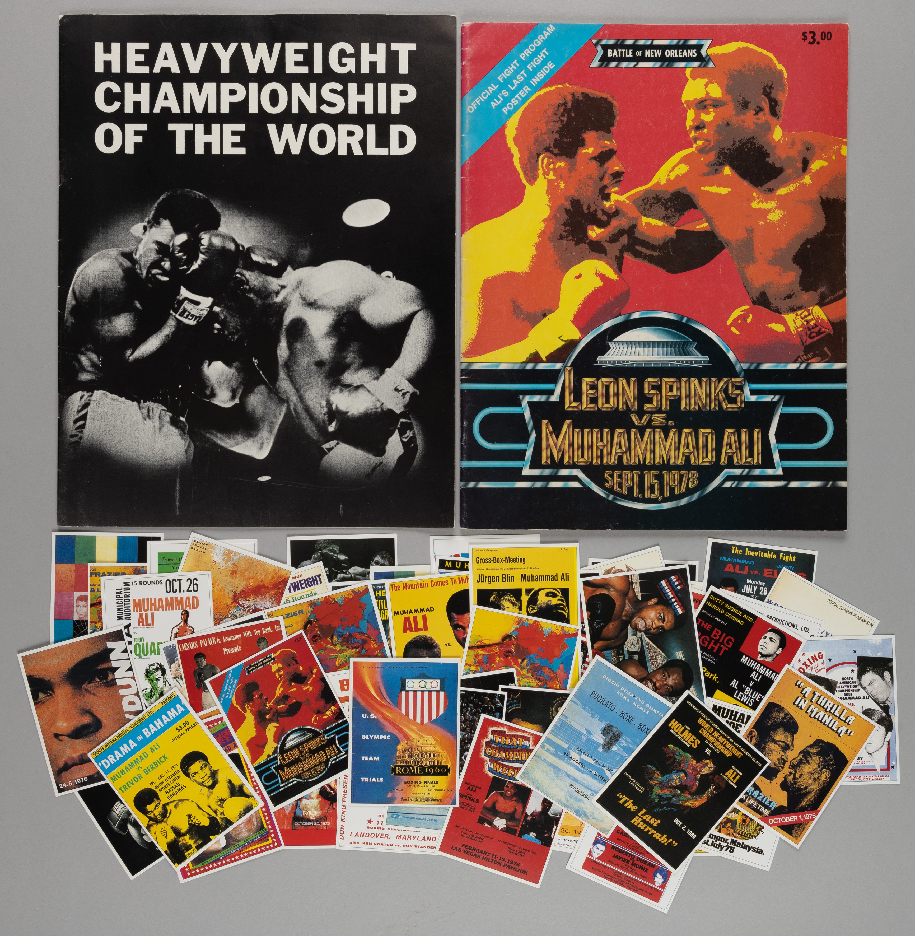 Muhammad Ali v. Sonny Liston Fight II boxing programme, 1965, original official 15-page site programme for the fight between Ali and Liston on 25th May 1965 in Lewiston , Maine, Muhammad Ali v. Leon Spinks programme, 15th September 1978 and a collection of Sporting Profile cards, (qty) Programmes in good condition