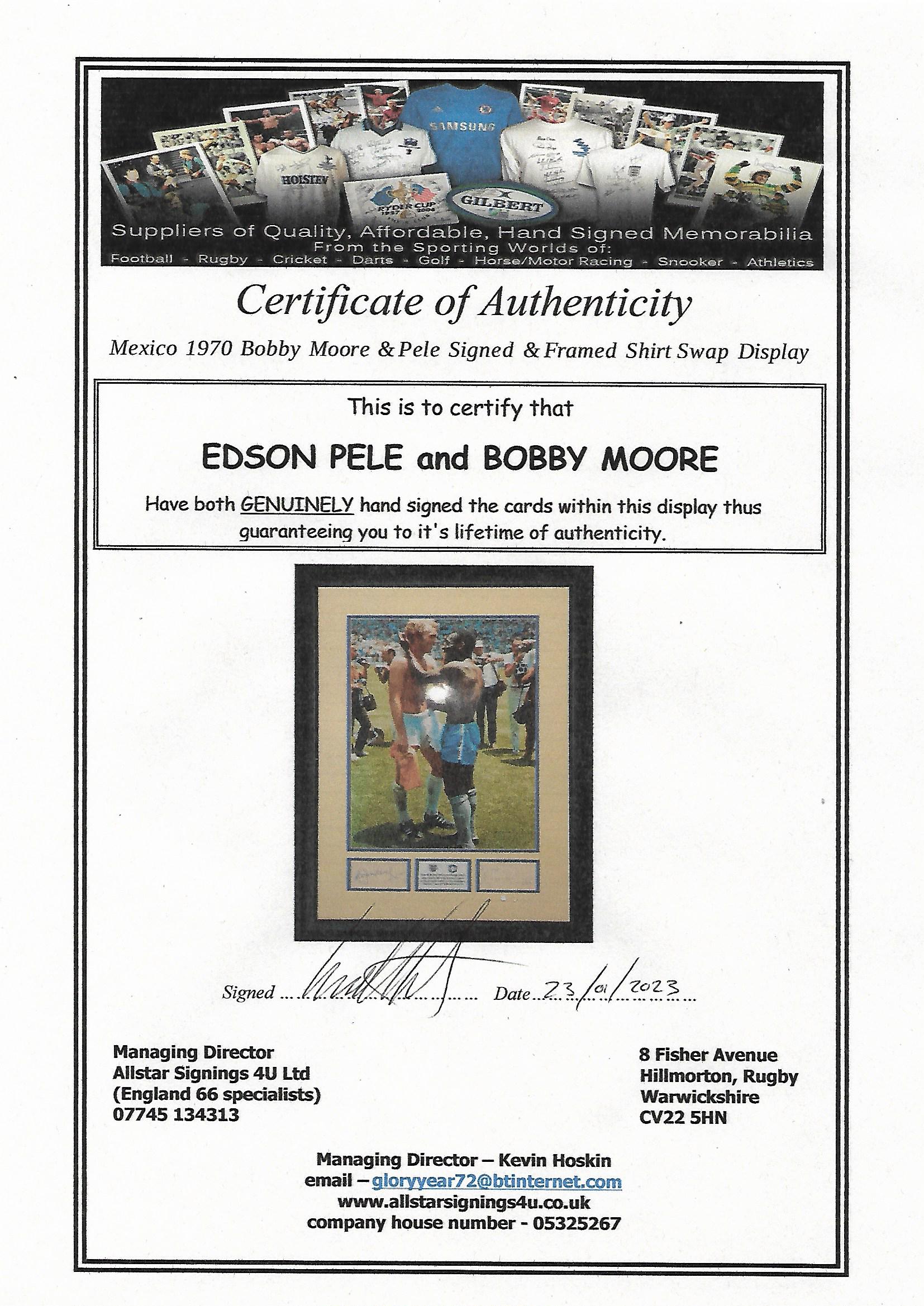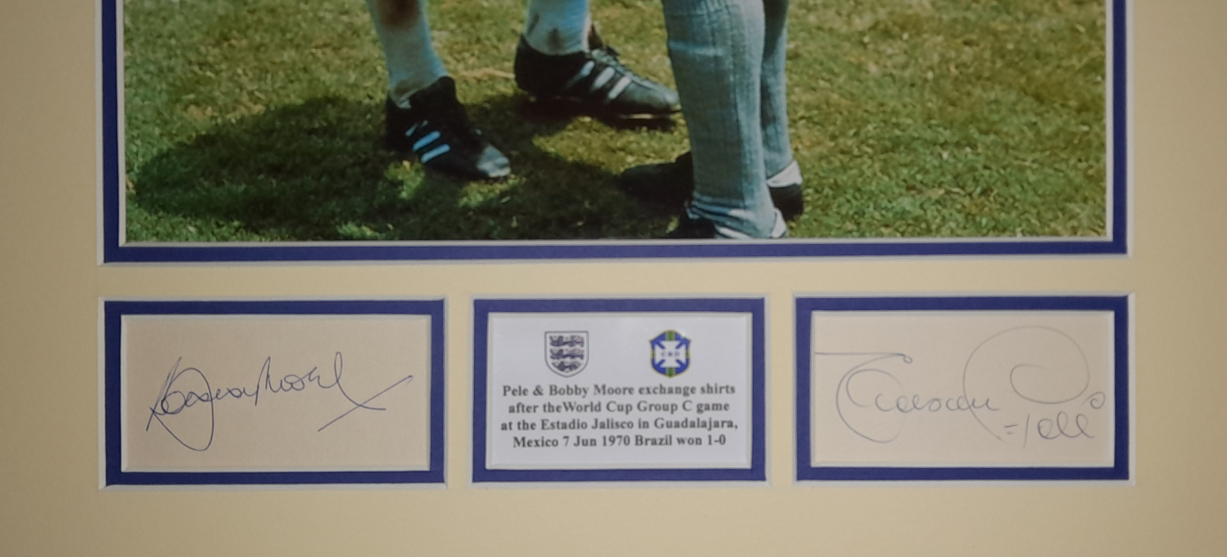 Stunning Bobby Moore / Pele dual signed and framed shirt swap Mexico 1970 World Cup printed photograph, features high quality lab printed photograph