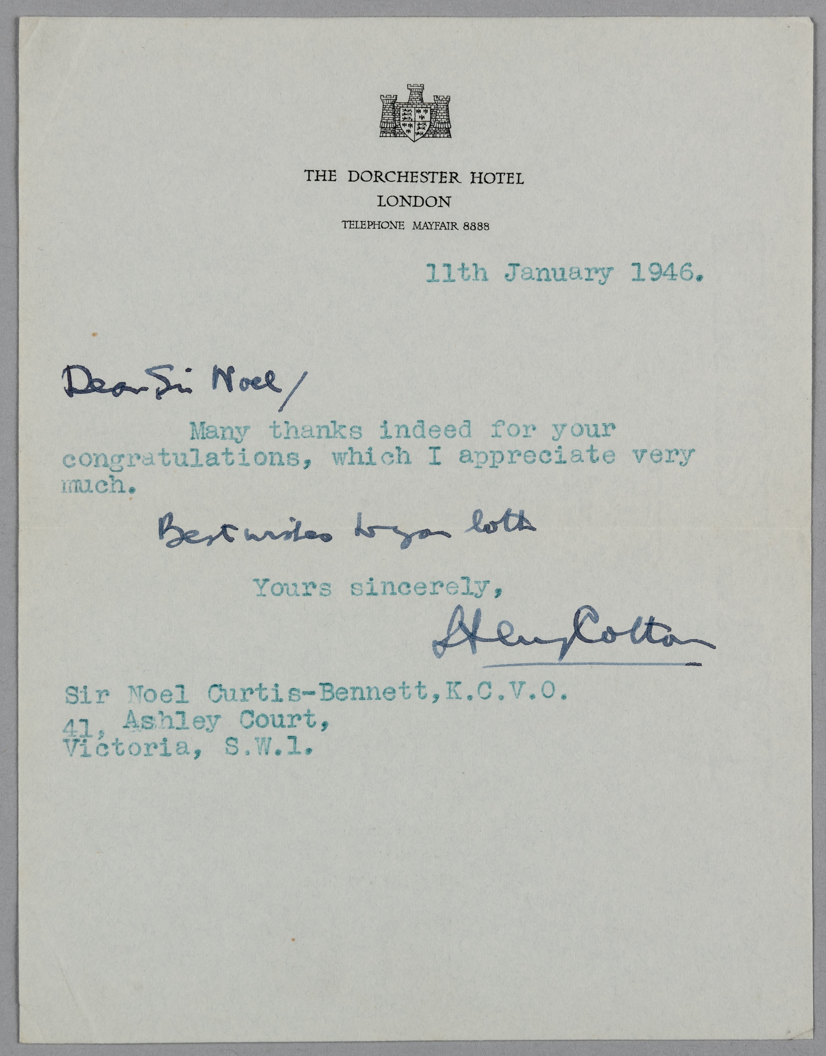 Henry Cotton three-time British Open Champion golfer 1934, 1937 & 1948 original signed letter, one-sided typed letter dated 11th January 1946, on Dorchester Hotel headed stationery, size 6.5 by 5in., autographed in ink by the three-time Open Champion, addressed to SIR NOEL CURTIS-BENNETT, regarding his appreciation for congratulations bestowed by Sir Noel, with amendments and full signature all in the hand of Henry Cotton, very good condition Sir Thomas Henry Cotton, MBE (28 January 1907 – 22 December 1987) was an English professional golfer. He won the Open Championship in 1934, 1937 and 1948, becoming the leading British player of his generation. The Rookie of the Year award in European Tour is named after him. Cotton loved the high life, including champagne and bespoke tailored clothes. He lived for a while in a suite in a 5-star hotel, and later bought an estate complete with butler and full staff, traveling everywhere in a Rolls-Royce.