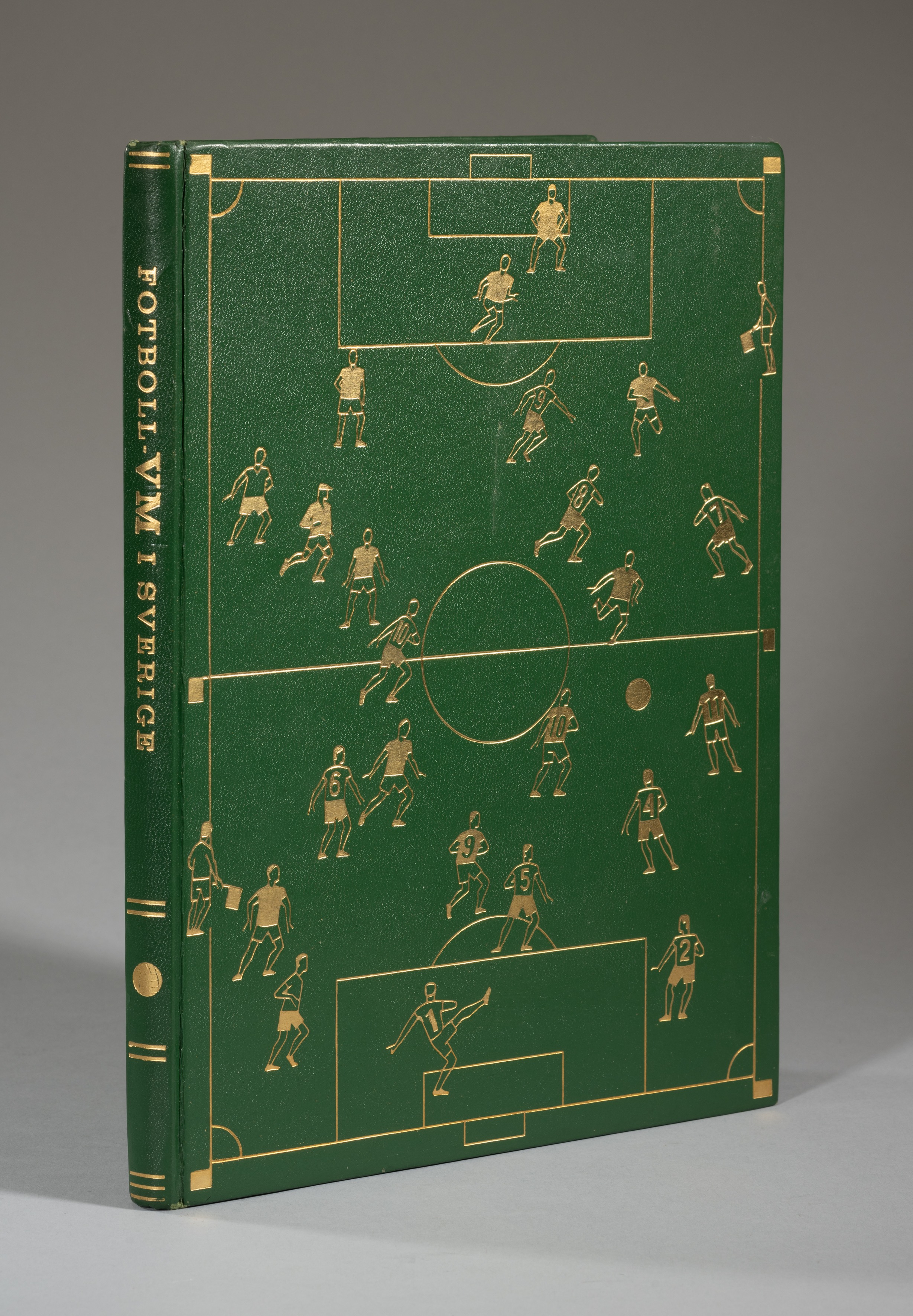 Jack Kelsey/Pele/World Cup 1958 superb hard backed book, green leather cover with gilt players in match formation and Football VM.I. Sveridge to spin