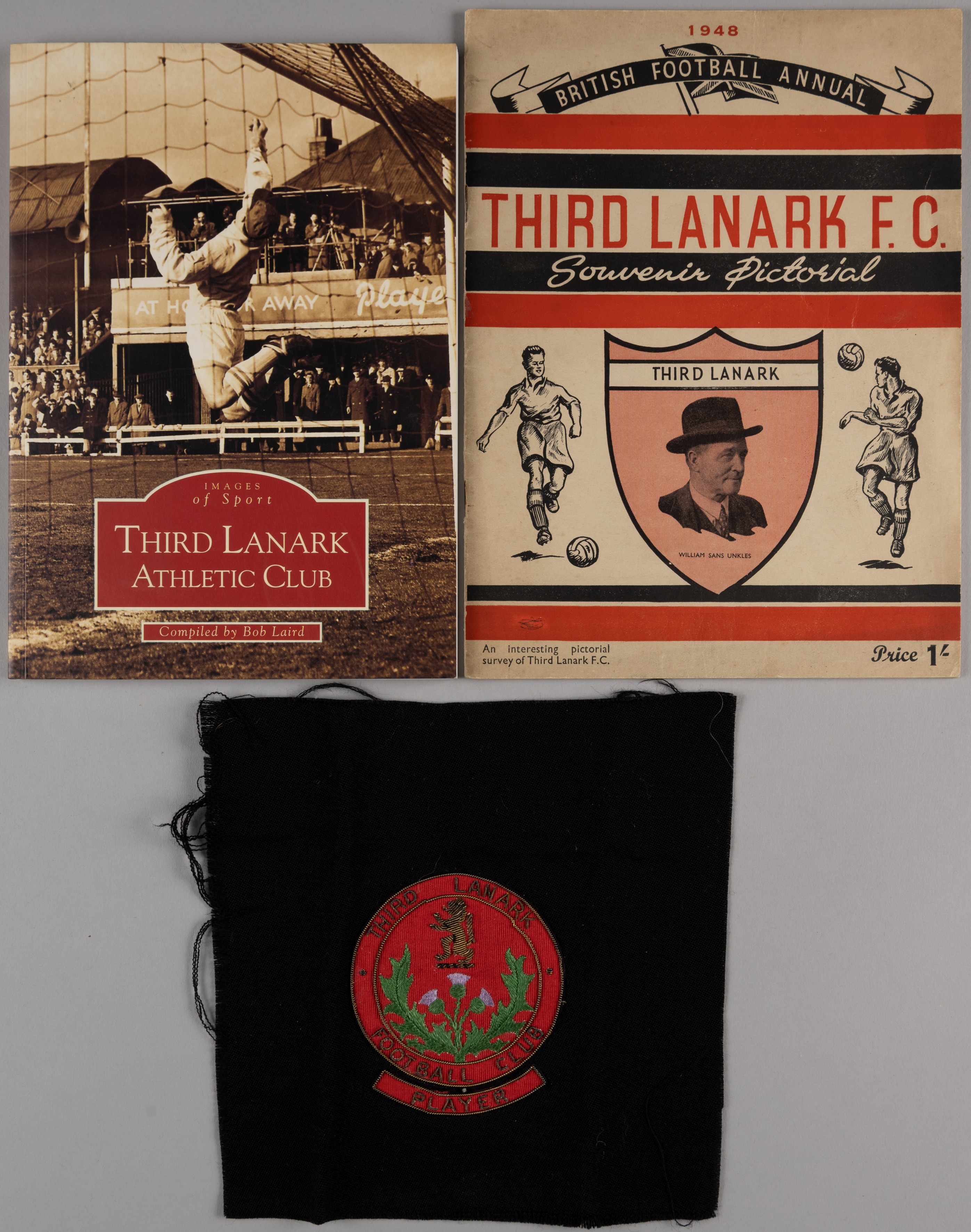 1948 Third Lanark F.C. Souvenir Pictorial Annual, a Third Lanark embroidered blazer badge inscribed THIRD LANARK FOOTBALL CLUB, PLAYER and Third Lanark Athletic Club, images of Sport, compiled by Bob Laird, 1st Edition, 1999, autographed by Bob Laird and Matt Gray (3) The blazer badge in this is lot is believed to have produced for the 1961 Tour of Canada