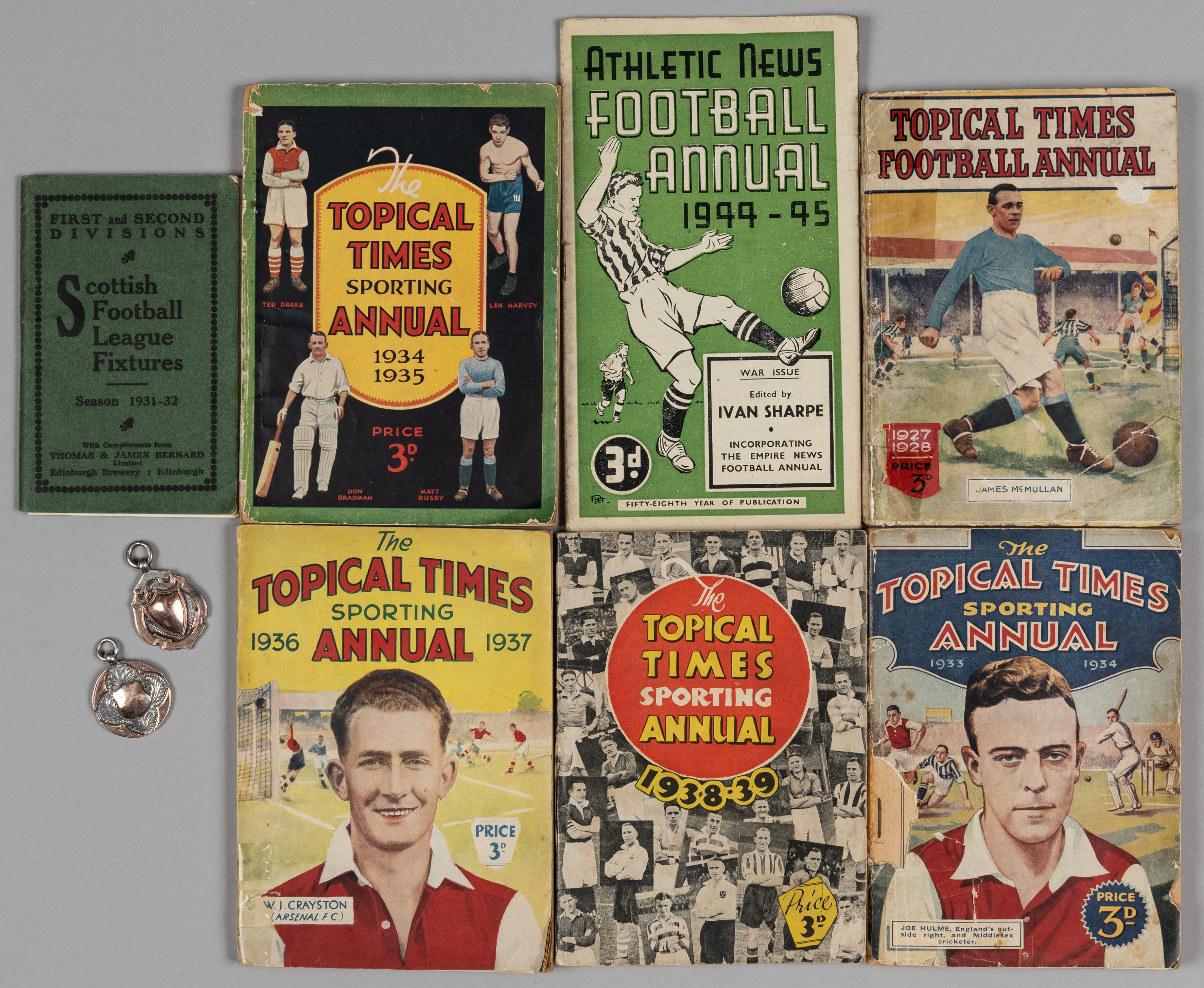 A collection of football ephemera including Topical Times colour portraits, Association Footballers, 1935-36 cigarette card album, signed Mikel Arteta photograph in Rangers kit, various Association Sport Photography black and white player action shots including Gazza, various football annuals including Scottish Football League Fixtures, 1931-32 and two silver medals, the reverse of one inscribed F & D W.L., Morrisons Cup, Won By J. Harvey, F.O.F.C.1928 and the other inscribed S.M.A.L., League Champions, F.O.F.C.,, J. Harvey 1933-34 (a lot)