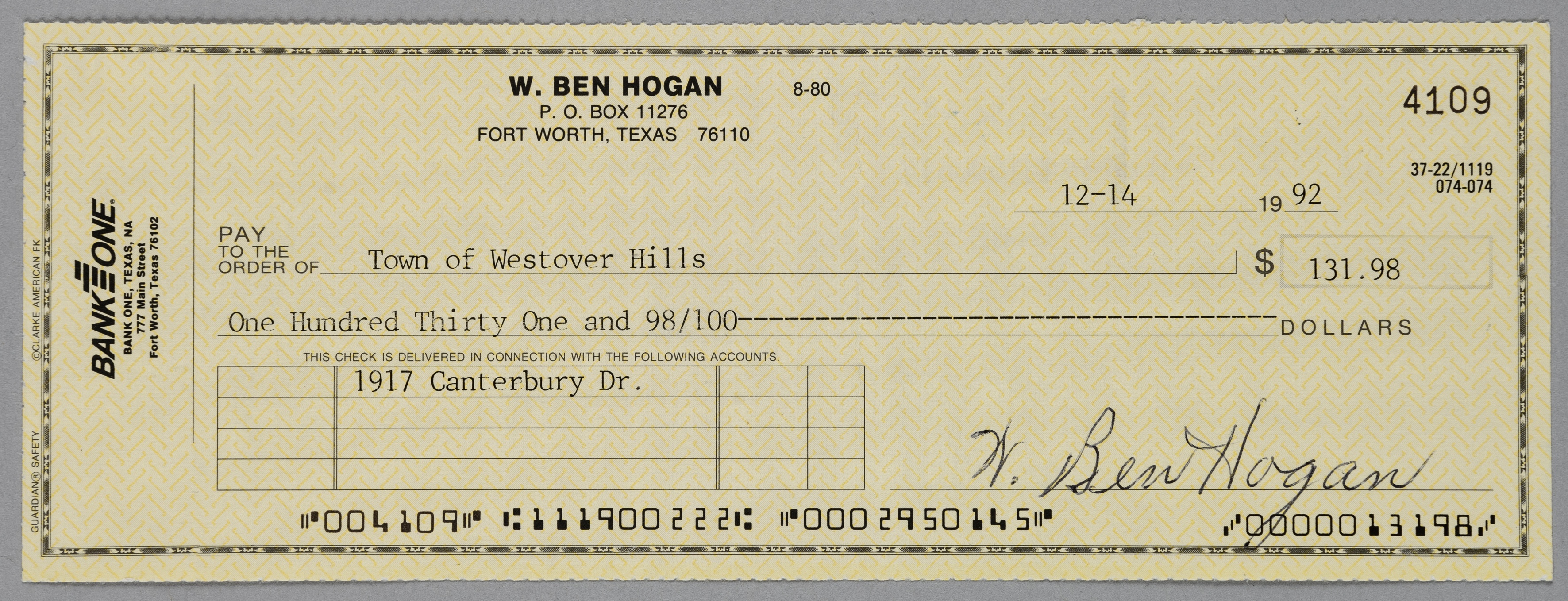 Ben Hogan nine Major Championship Victories 1948-53 scarce original signed personal cheque, size 8.25 by 3in., from Bank One, Fort Worth, Texas, dated December 14th 1992 for the amount of $131.98 made payable to the town of Westover Hills, very nicely signed in ink to the lower right corner W. BEN HOGAN, very good condition William Ben Hogan (August 13th 1912 – July 25th 1997) was an American professional golfer who is generally considered to be one of the greatest players in the history of the game. He is notable for his profound influence on golf swing theory and his ball-striking ability. Hogan's nine career professional major championships tie him with Gary Player for fourth all-time, trailing only Jack Nicklaus (18), Tiger Woods (15) and Walter Hagen (11). He is one of only five players to have won all four majors: The Masters, The Open Championship (despite only playing once), the U.S. Open and the PGA Championship. The other four are Nicklaus, Woods, Player, and Gene Sarazen; Hogan's first major win came at the age of 34.