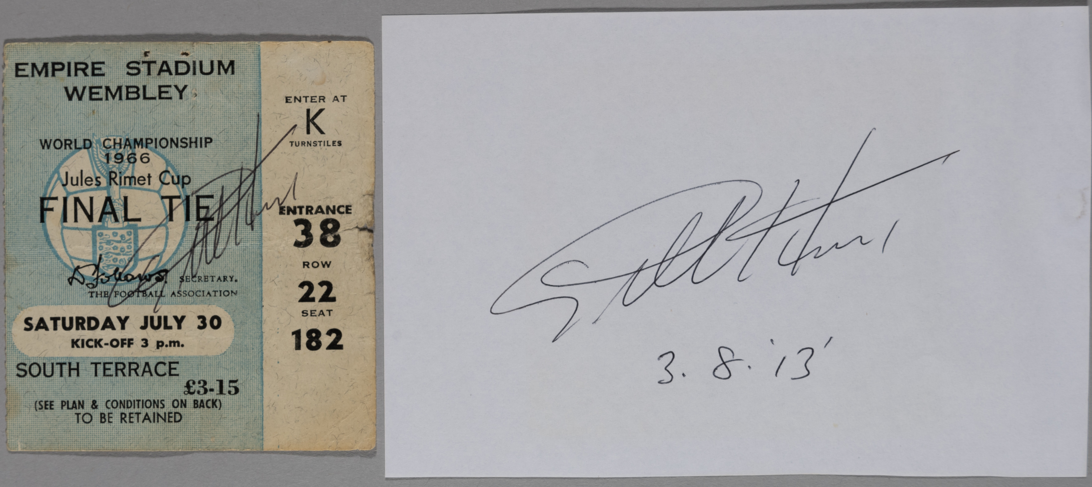 A 1966 World Cup Final ticket stub, autographed by Geoff Hurst, and a piece of plain white paper autographed by Geoff Hurst (2) Ticket with signs