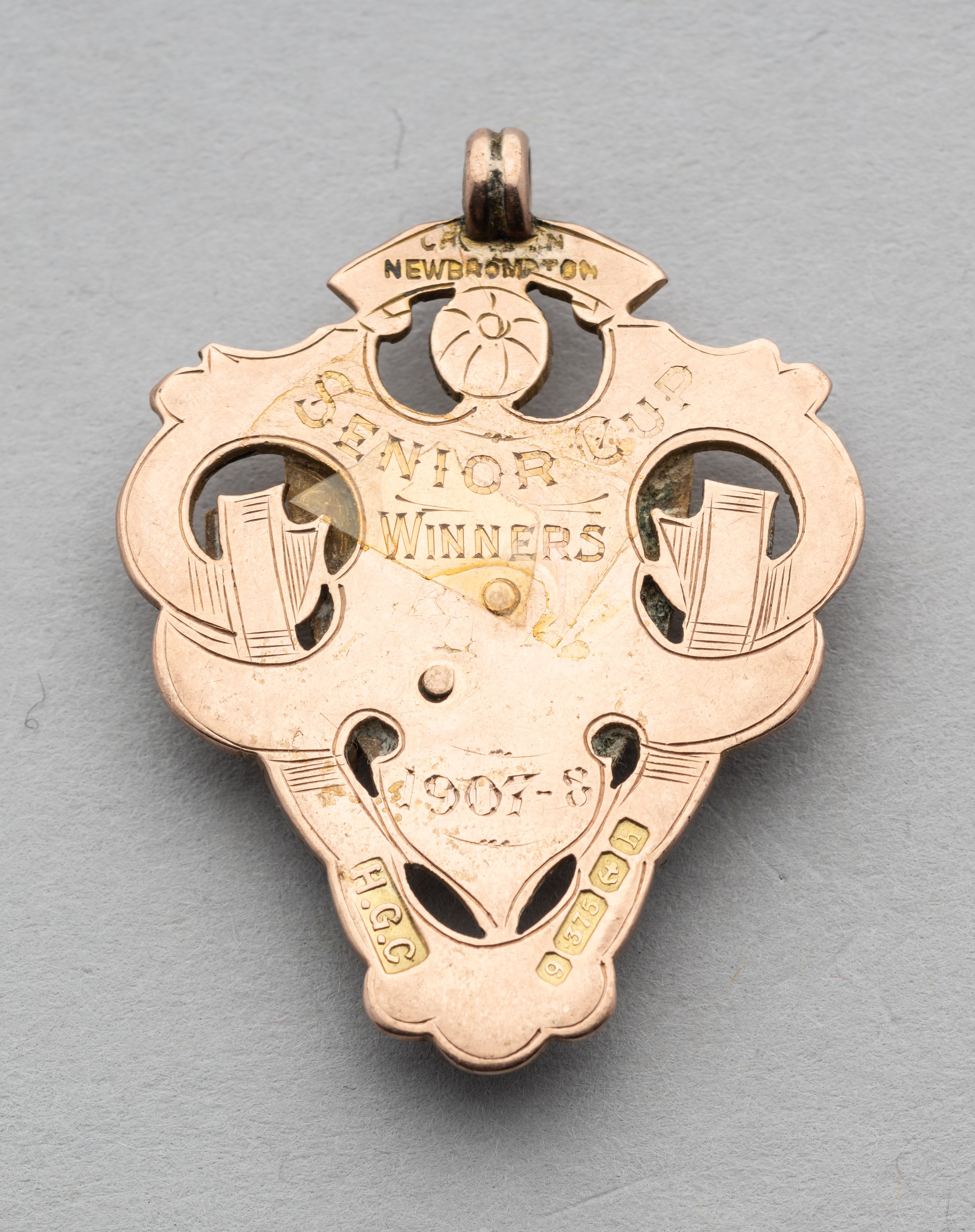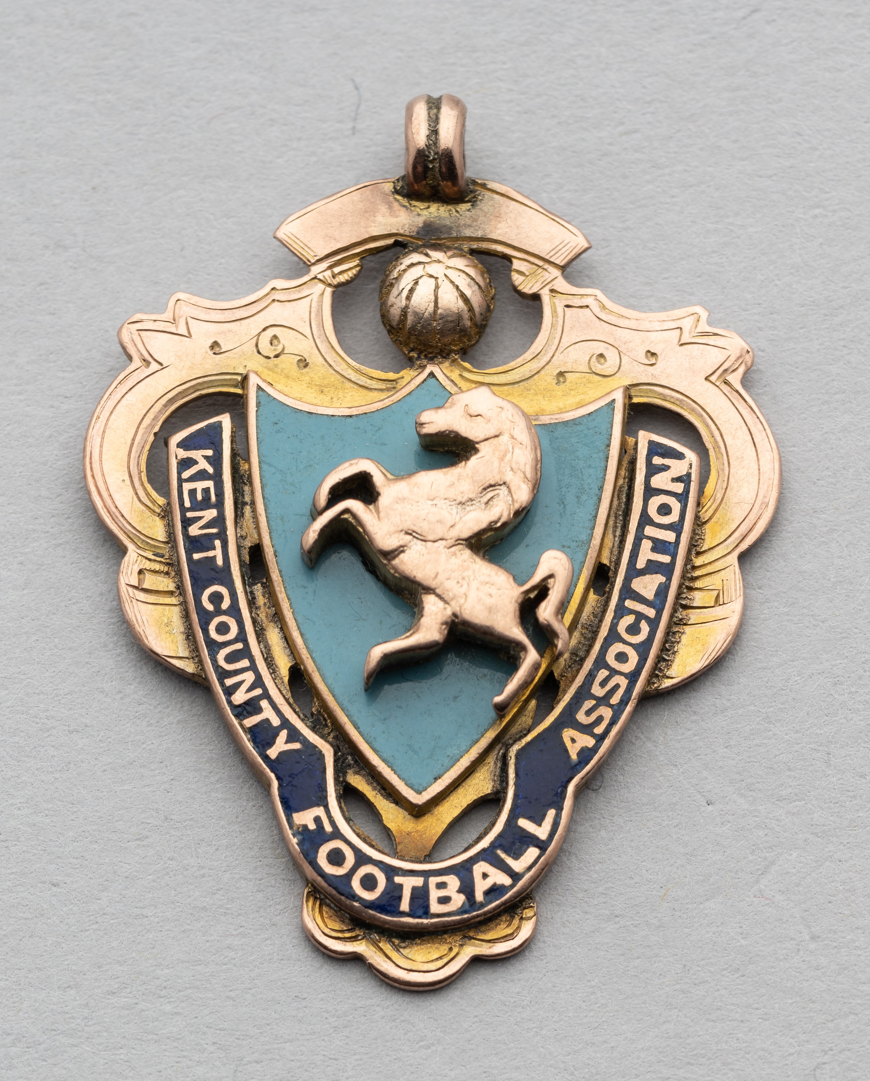 9ct gold & enamel Kent County FA Senior Cup winners medal 1907-08, inscribed with competition details, weight 10gms. The winner this season was Tun