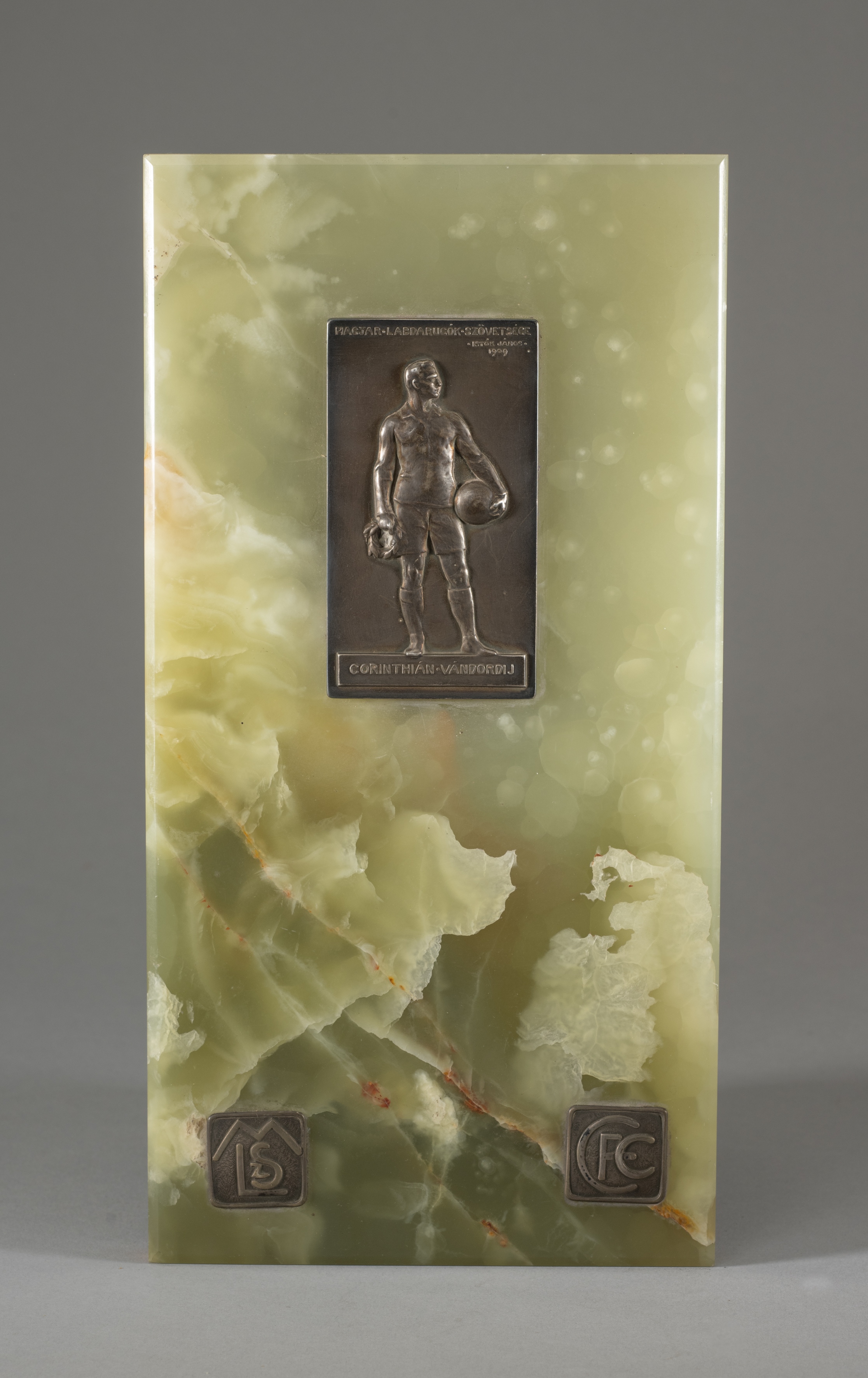 Trophy plaque presented by the Hungarian Football Association to Corinthian Football Club in 1909, large onyx plinth set with a rectangular plaque featuring a football, designed by the artist Istok Janos, and dated 1909, inscribed MAGYAR LABDARUCOK SZOVETSEGE, CORINTHIAN-VANDORDIJ, set beneath with two respective crests, overall 27 by 14 by 2cm.