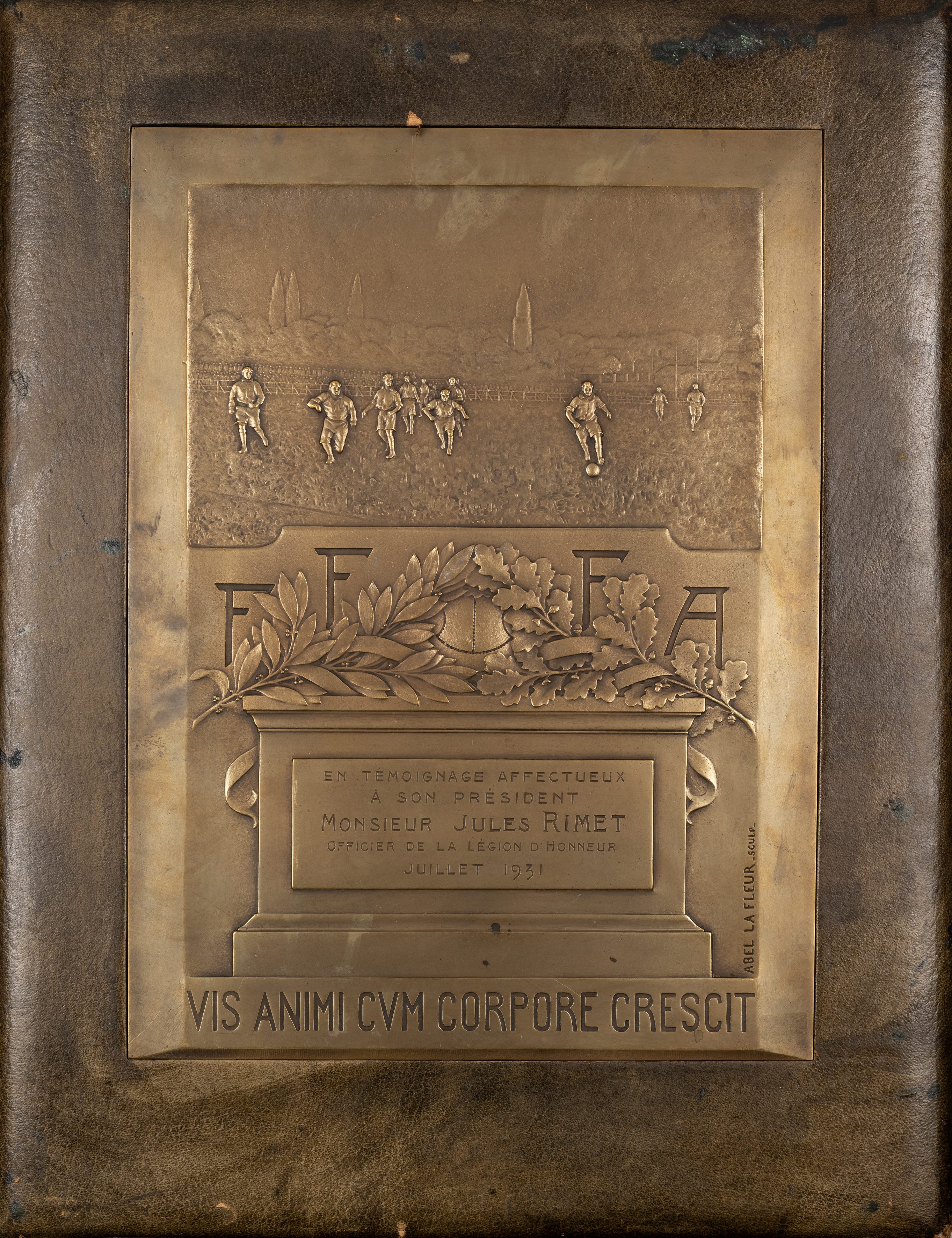 A rare and important plaque presented to Jules Rimet, 1931 by the French Football Association, presented to the 'Father of the World Cup' Jules Rimet by the French Football Federation in July 1931, the plaque inscribed FFFA, En Témoignage Affectueux, á Son Président, Monsieur Jules Rimet, Officier De La Légion D'Honneur, Juillet 1931, VIS ANIMI CVM CORPORE CRESCIT, the plaque, cast with a scene of a football match above a pedestal supporting a football flanked by Laurel and oak leaves, signed by the artist Abel Le Fleur, inset with a leather easel frame, 15 3/4 by 11 3/4 in. (40 by 27.8cm) The award was presented in recognition of the work of Jules Rimet as President of the French Football Federation (FFF) and his 10th anniversary as President of FIFA. Rimet worked tirelessly to being about the inaugural World Cup held in Uruguay in 1930, the year before this presentation. This plaque was designed by the Abel La Fleur who had also been responsible for the design of the World Cup trophy, which was later to become known as the Jules Rimet Trophy. Jules Rimet (1873-1956) became President of the FFF in 1919 and President of FIFA in 1921. Rimet has been described as a diplomat, persuader, sometimes intransigent, but always devoted to the game of football. He remained President of the world governing body until 1954. In 1928 at the Amsterdam Olympic Games, where Uruguay retained their Olympic title in the football competition, it was agreed that a World Cup Tournament should take place. Being double Olympic champions - and effectively World Champions - Uruguay offered to host the event which in 1930 also coincided with the celebration of their 100th year of independence as a nation. Uruguay even paid the travelling expenses of the teams who made the journey to South America to take part. A new stadium was built in Montevideo (constructed in just 8 months!) and perhaps, fittingly, the host nation was crowned the first World Champions, defeating Argentina 4-2 in the final. This plaque is a poignant piece of memorabilia relating to the 'Father of the World Cup' an his remarkable legacy.