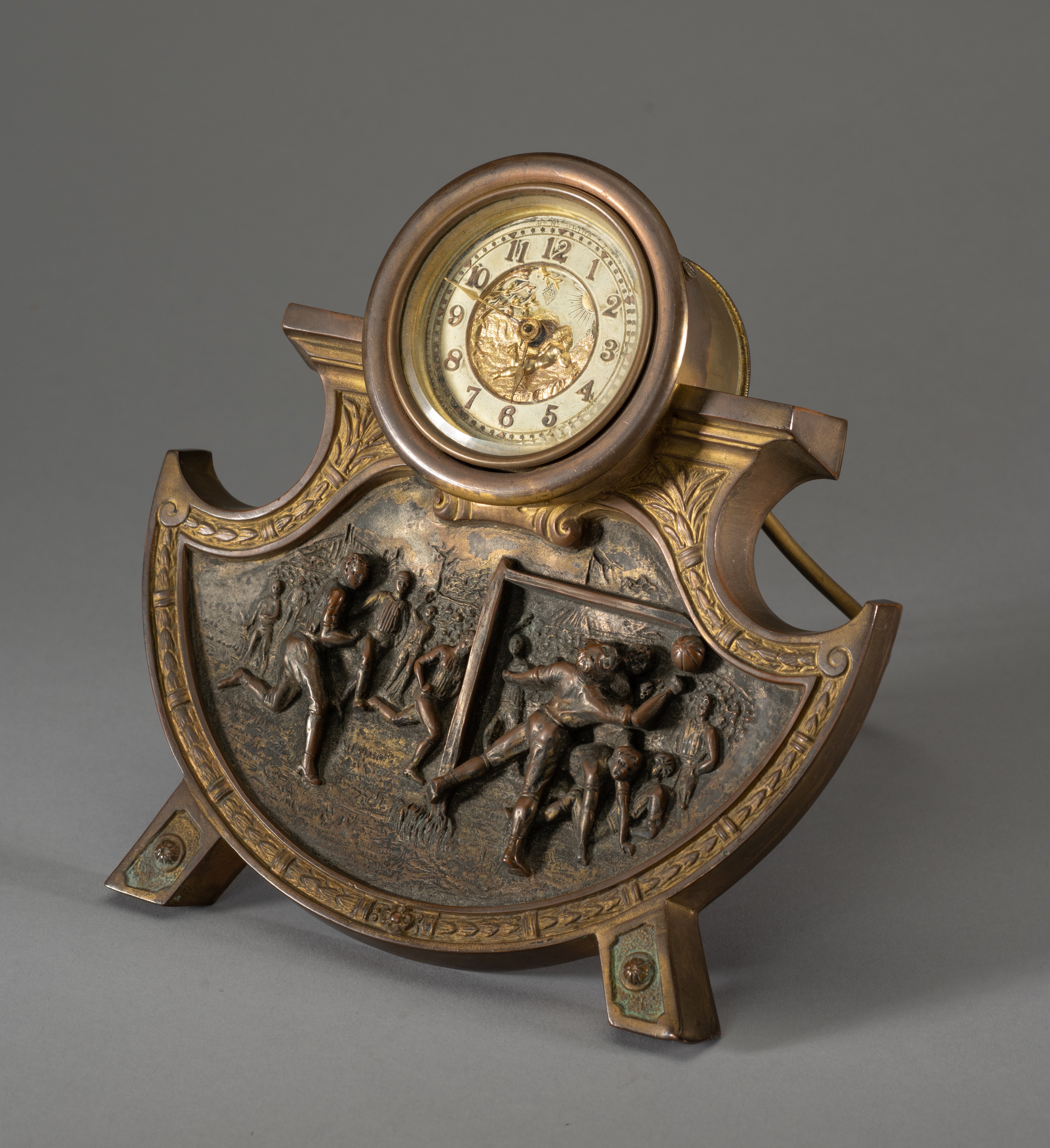 Victorian brass football clock, circa 1890, patented in Great Britain and France by the British United Clock Company, Birmingham, the body beneath the dial with a football match design in high relief, movement not running, but clock in good condition, 20 by 20cm.