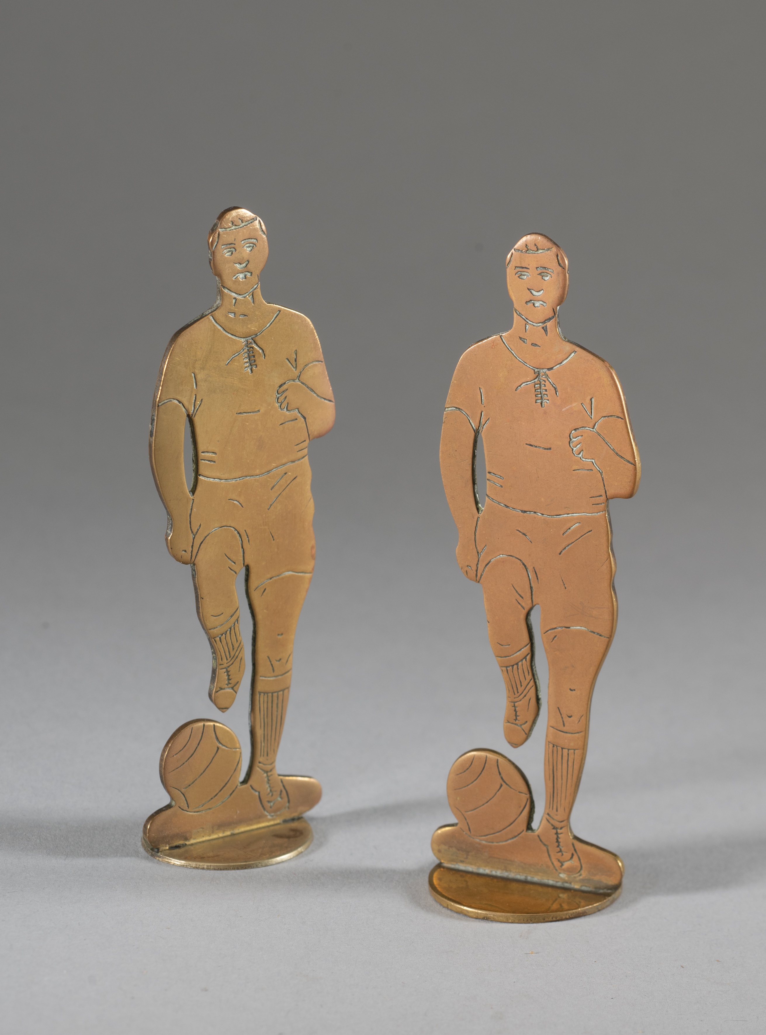 Pair of brass footballer adornments early 20th century, each flatware footballer set on a circular base, one base drilled, (2)