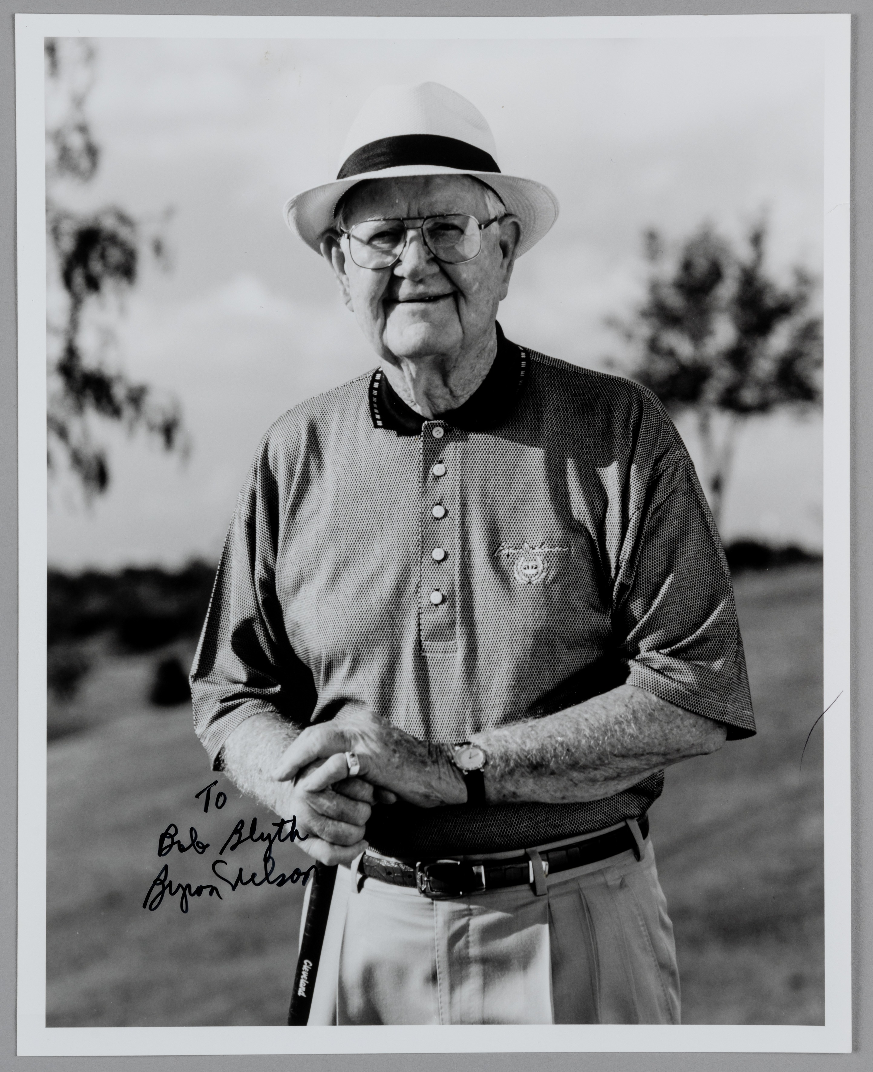 Byron Nelson 1937 & 1942 Masters Champion and 1939 U.S Open golf champion original autographed b&w photograph, 10 by 8in., depicting Nelson three-qua