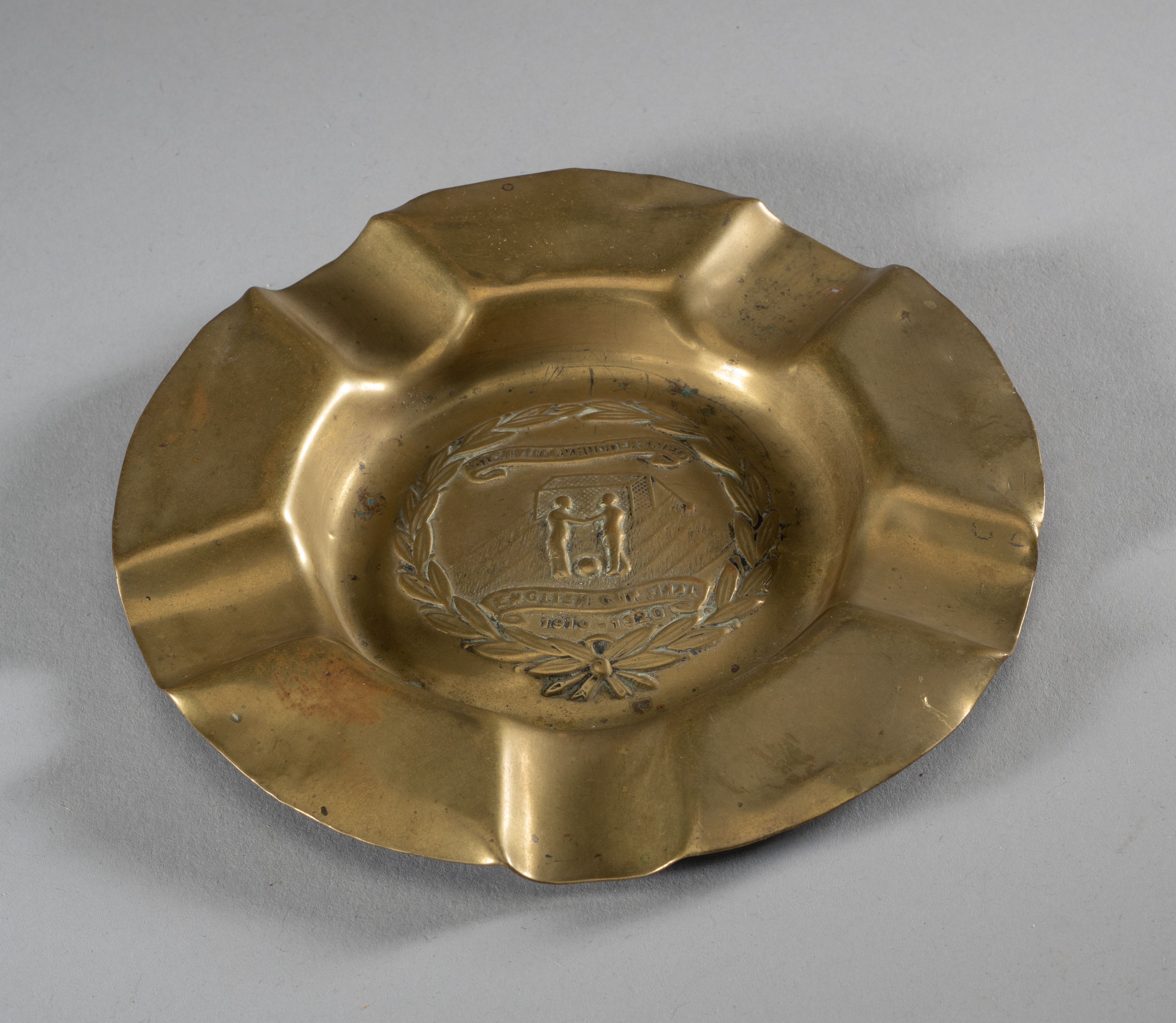 Brass ashtray being a souvenir of the 1920 F.A. Cup Final Aston Villa v Huddersfield played at Chelsea's Stamford Bridge ground, decorated with laure