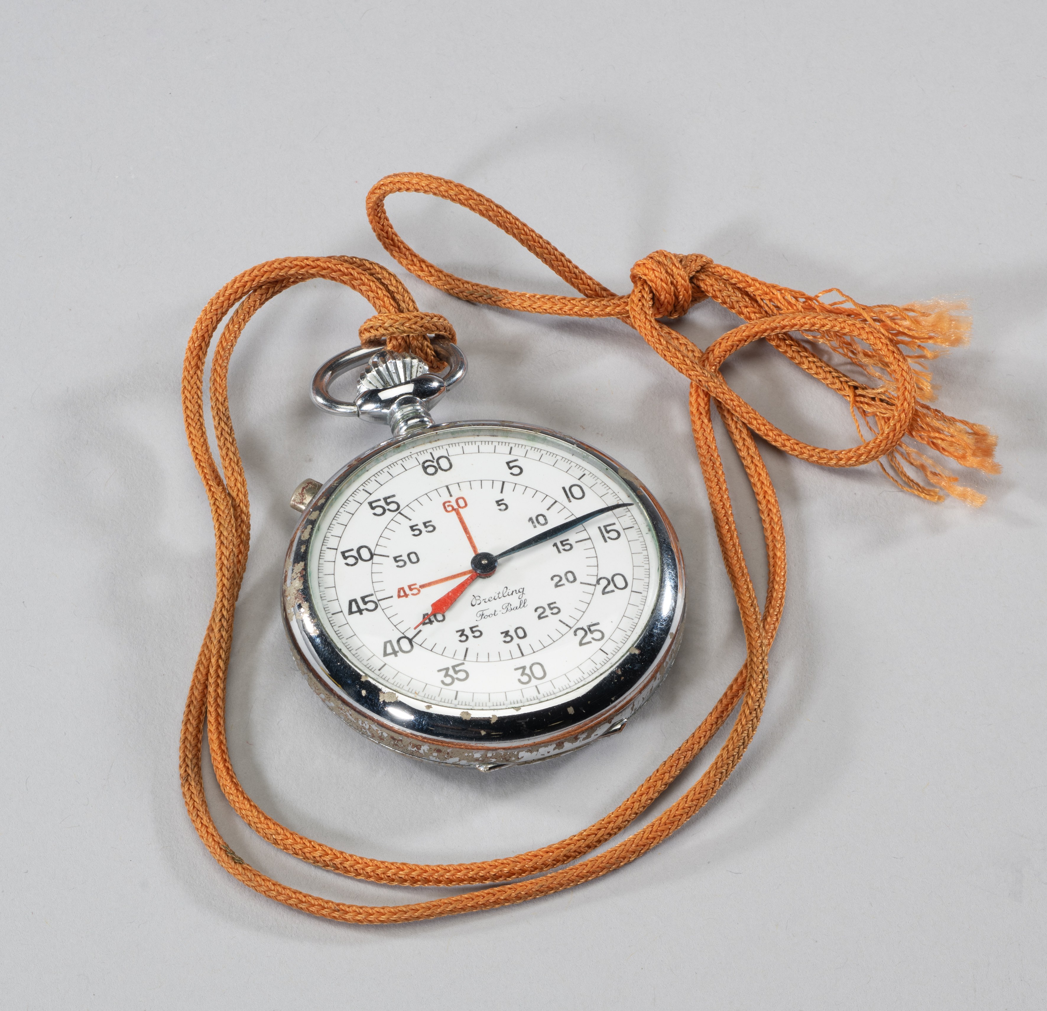 A rare white-metal Breitling Foot Ball Chronograph presented to 1954 World Cup Final referee William Ling, the case inscribed W. LING, ENGLAND, WORLD CUP 1954, inoperable It is believed the stopwatch was presented by F.I.F.A. to English referee William Ling to commemorate the Englishman taking charge of the 1954 World Cup Final. In the match played on 4th July 1954 at the Wankdorf Stadium in Bern, West Germany defeated the pre-match favorites Hungary 3-2 The case is marked and scuffed he watch movements have corroded and the watch is not functioning. It has been looked at by the watchmakers at Breitling in Bern Switzerland, and vendor was informed that it could not be restored The 1954 World Cup final played between Hungary and West Germany, known as "the Miracle of Bern", is undoubtedly one of the most notable and historically significant football matches of all time. It was full of drama and, even to this day, the controversy persists with accusations of match-fixing, continued claims of multiple errors by officials. In the middle of the pitch was the English FIFA referee William (Bill) Ling. After he retired in 1955, he and his wife moved to Canada which at that time certainly would not be mistaken as a footballing nation. Settling in a small town in the province of New Brunswick and spending some time at a second property in Nova Scotia meant that global footballing lore, legend, and infamy would be unlikely to ever follow them. So William, his wife, and this watch -- a beautiful piece of one of football's most significant moments -- slipped into obscurity. In fact, it wouldn't be until now, nearly 70 years later, that this item would ever be seen by the public. After William's death in 1984 in New Brunswick, he was survived by his wife, who would live for a couple of decades longer. It was upon her passing that their estate went to the highest bidder at auction in a small town in Nova Scotia. There, a pair of local antique shop owners would be blown away by the items they found amongst the Lings' possessions. The current owner of this watch visited the antique dealers to buy the watch from them.