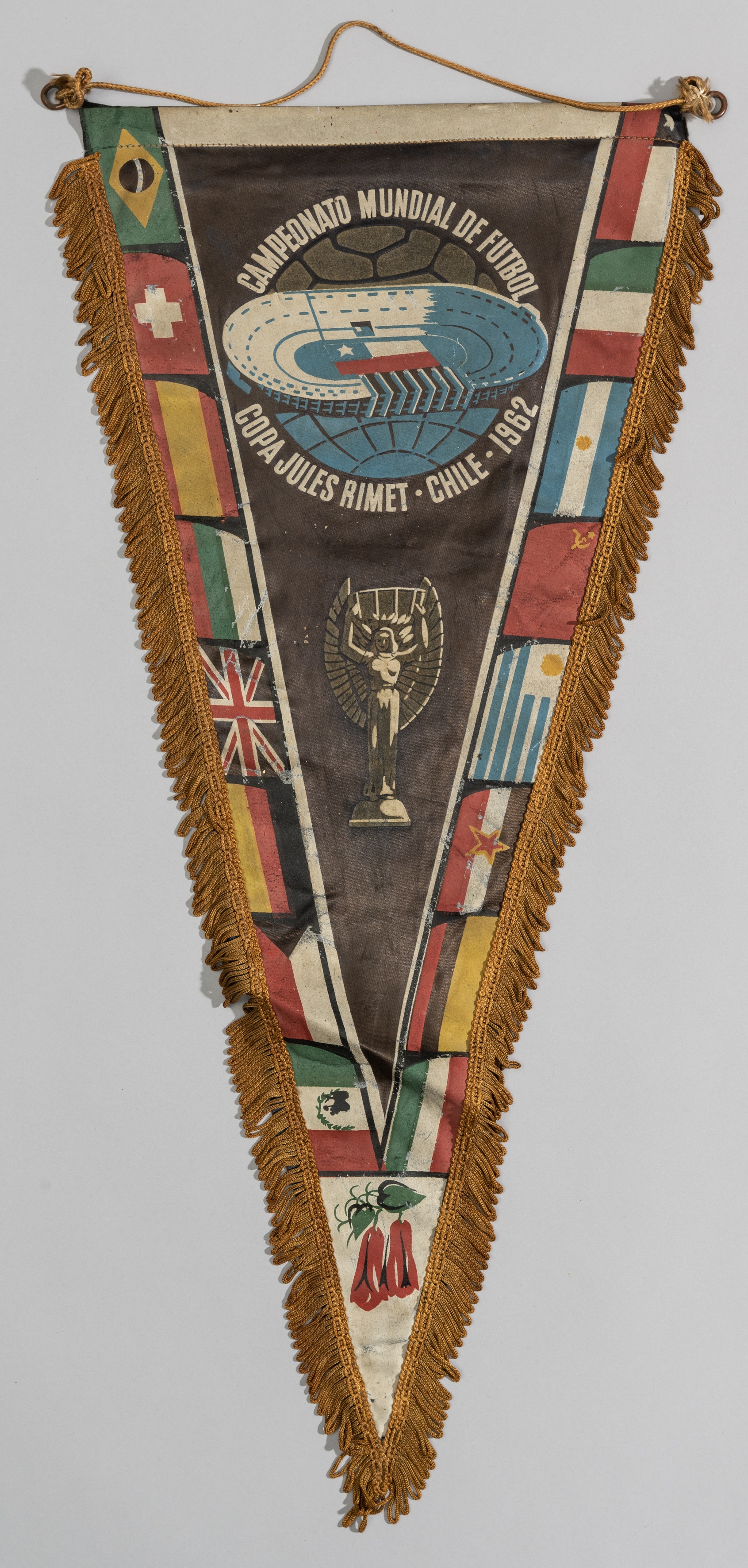 Football World Cup 1962 Chile original pennant, 24 by 10in. approx., with stadium and World Cup to centre with flags of competing teams to edge, has hanging bar and tassels to edge with legend around stadium 'Campanato Mundial De Futbol' Copa Jules Rimet 1962. Rare authentic item from Chile World Cup, has name to rear 'La Casa Del Banderin' (Home of Banners) Estado 33 Local 15 Santiago De Chile
