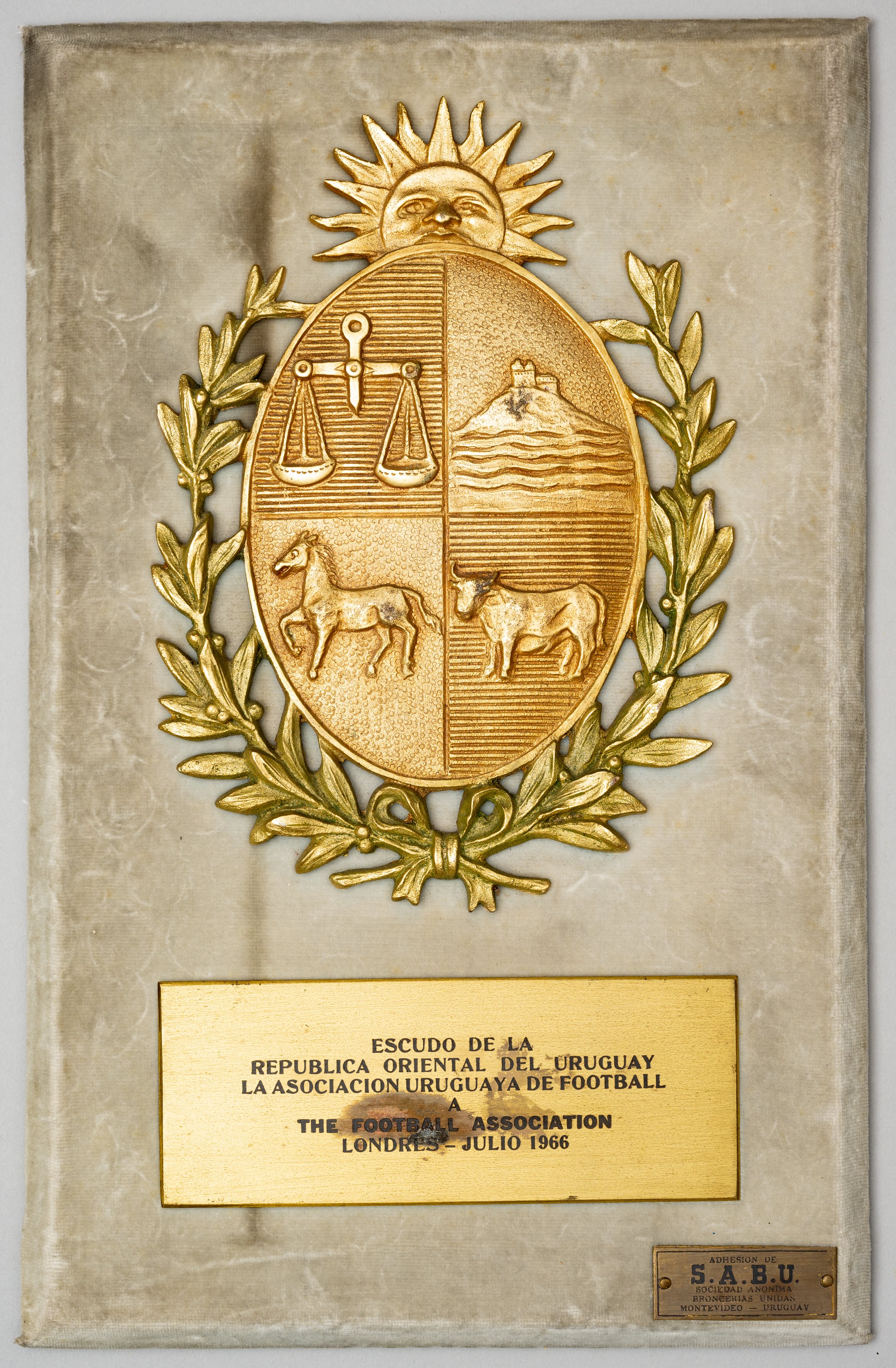 Uruguayan Football Association plaque presented to the Football Association at the 1966 World Cup, bearing the Coat of Arms of Uruguay in gilt-metal laid down on a velvet covered bevelled backboard together with a plaque inscribed ESCUDO DE LA REPUBLICA ORIENTAL DEL URUGUAY LA ASOCIACION URUGUAYA DE FOOTABLL A THE FOOTBALL ASSOCIATION, LONDRES - JULIO 1966, also set with a maker's plate inscribed ADHESION DE S.A.B.U. (Sociedad Anonima Broncerias Unidas, Montevideo - Uruguay), marks and staining to inscribed plaque, velvet grubby, the metal coat of arms good, 36 by 23cm. England played Uruguay in the opening match of the 1966 World Cup at Wembley Stadium on 11th July. The game ended as a 0-0 draw.