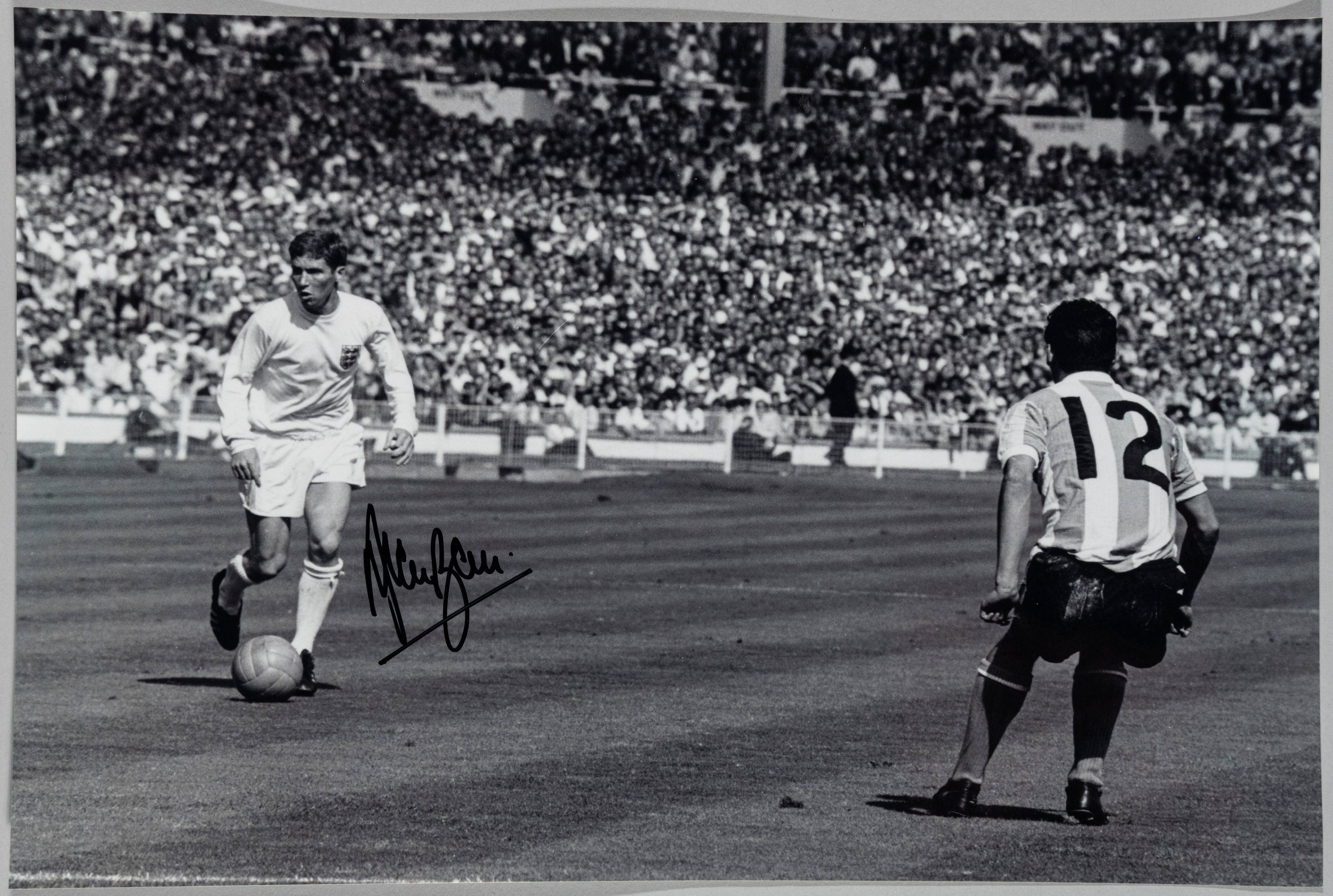 Alan Ball signed b&w photograph of Ball in action for England v Argentina during the 1966 World World Cup match, 12 by 8in., signed in black marker