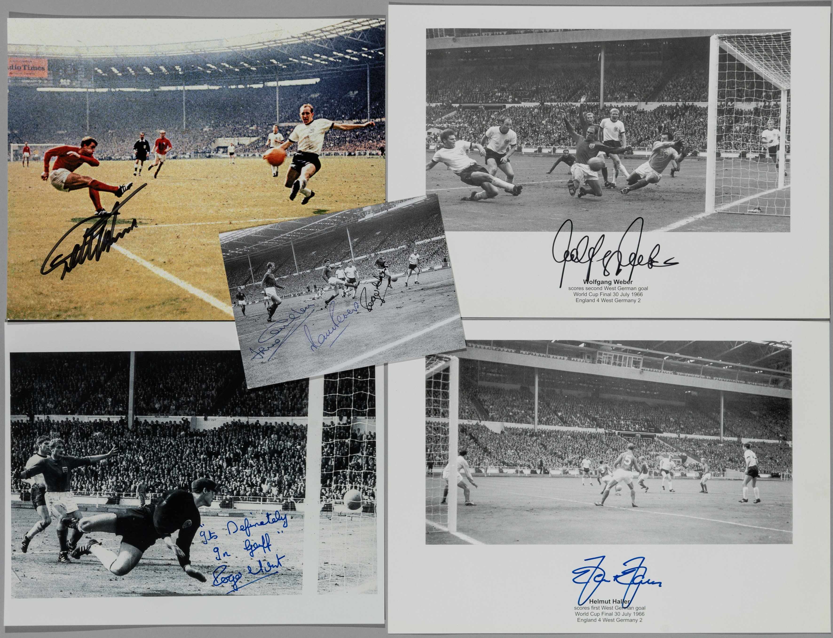 World Cup England 1966 group of five signed images of all the goal scorers in the final v Germany, comprising Geoff Hurst signed 20 by 25cm. colour photograph shooting his second goal, signed in black marker pen, with COA; b&w postcard signed by Peters, Jack Charlton and Roger Hunt; Wolfgang Weber b&w 21 by 29cm. image scoring the second Germany goal, signed in black marker pen with COA; Helmut Haler b&w 21 by 29cm. image scoring the first Germany goal, signed in blue marker pen with COA; a b&w 20 by 25.5cm. photograph of the controversial Hurst goal signed by Roger Hunt, the nearest England player to the goal line and inscribed 'It's definitely in, Geoff', in blue marker pen, (5) Provenance: Graham Budd Auctions Lot 388 20th November 2007