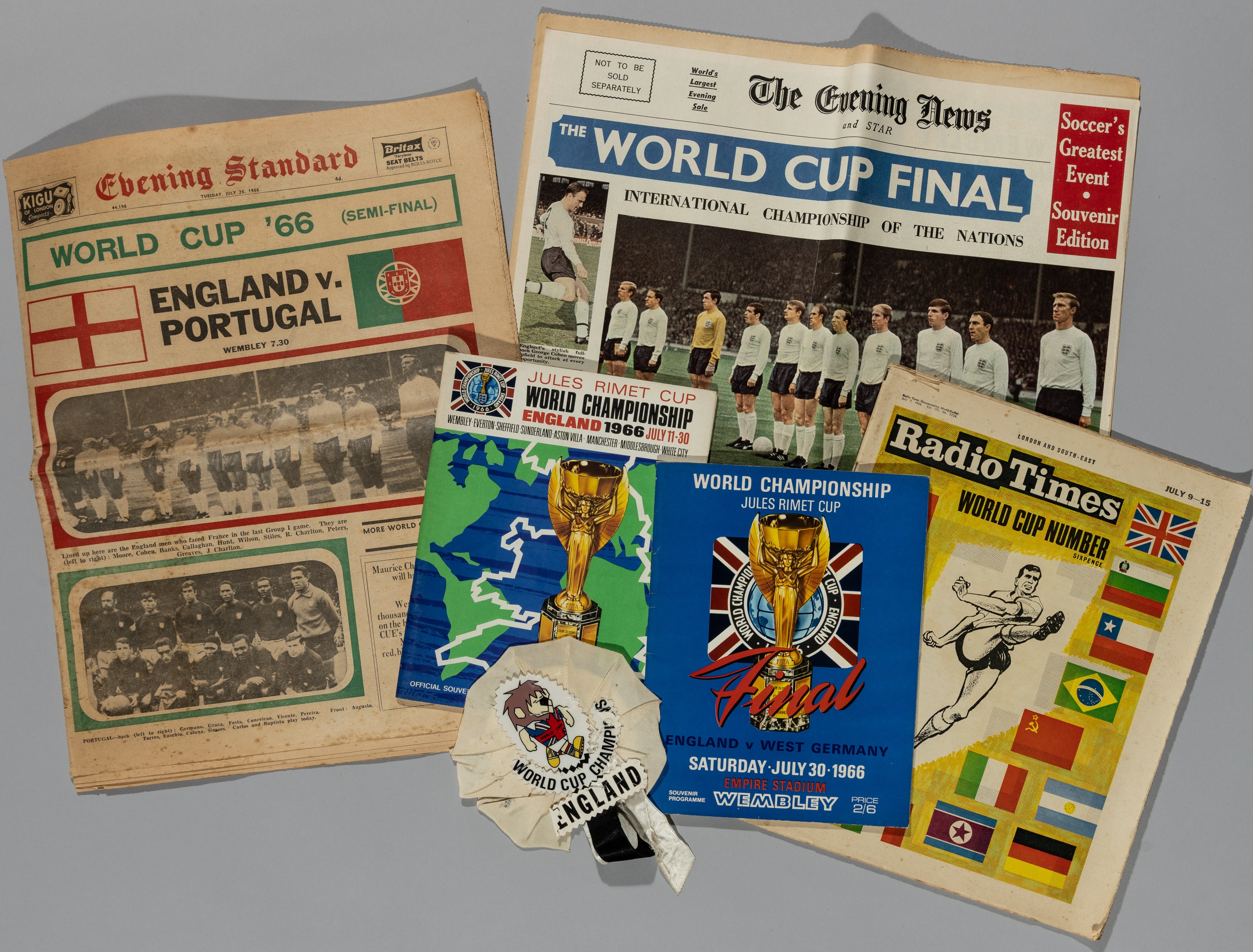 World Cup 1966 selection, includes World Cup final v Germany signed by four England players to inside bookplate by Hurst, Stiles, Greaves, Cohen; World Cup brochure, programme, World Cup Willie rosette 'England World Champions' and full newspapers Evening Standard semi-final v Portugal, Evening news final Germany and Radio Times covering World Cup, (6)