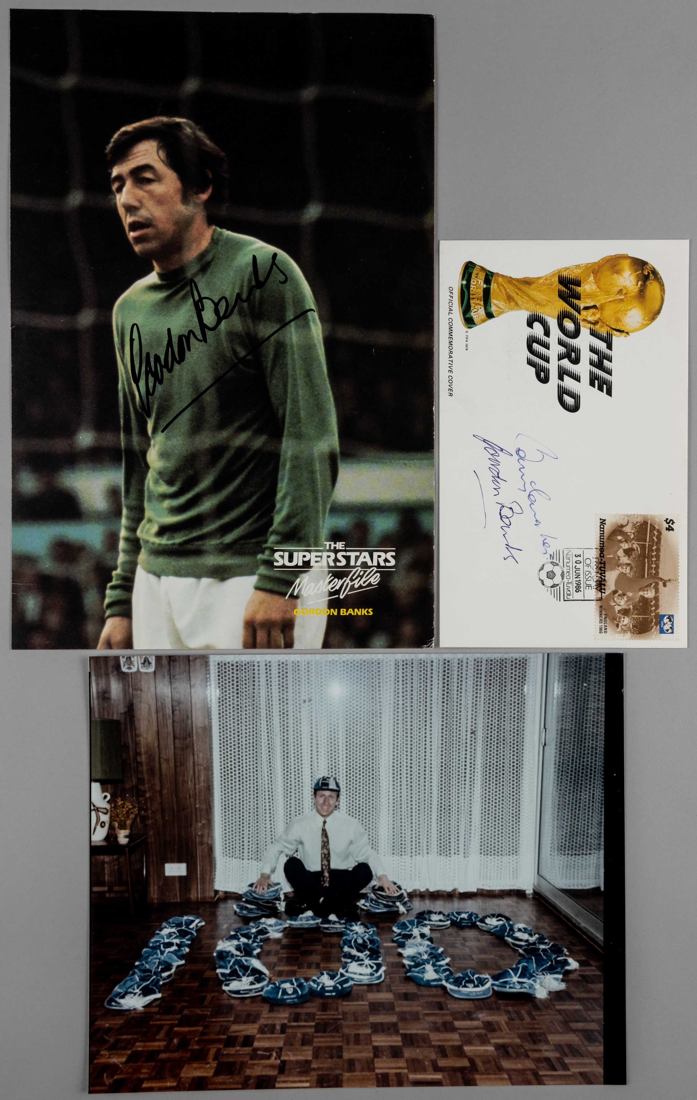 Bobby Charlton and Gordon Banks England 1966 World Cup Winners good original signed First Day Cover, size 7.5 by 4.5in., postmarked 30th June 1986, commemorating the 1986 World Cup and the 20th anniversary of England winning the 1966 World Cup, bearing the original ink autographs of both Bobby Charlton and Gordon Banks to the lower clear portion of the cover. Sold with a colour 10 by 8in. photograph of Bobby Charlton surrounded by his 100 England caps and a colour Superstars Masterfile page autographed in black pen by Gordon Banks, all three items in very good condition, (3) Sir Robert Charlton CBE (born 11th October 1937) is a former English footballer who played as an attacking midfielder. He is regarded as one of the greatest players of all time, and an essential member of the England team who won the World Cup in 1966, the year he also won the Ballon d’Or. He played almost all of his club football at Manchester United (making 758 appearances) and in 1968, he captained the Manchester United team that won the European Cup, scoring two goals in the final to help his team be the first English side to win the competition. He is United's second all-time leading goal scorer (249), being surpassed by Wayne Rooney, and held the distinction of being England's all-time top goal scorer (49) from May 1968 to September 2015, when again, Wayne Rooney surpassed his record. Gordon Banks OBE (30th December 1937 – 12th February 2019) was an English professional footballer who played as a goalkeeper. He made 679 appearances during a 20-year professional career, and won 73 caps for England, highlighted by starting every game of England’s 1966 World Cup victory. Regarded as one of the greatest goalkeepers of all time, Banks was named FWA Footballer of the Year in 1972, and was named FIFA Goalkeeper of the Year on six occasions
