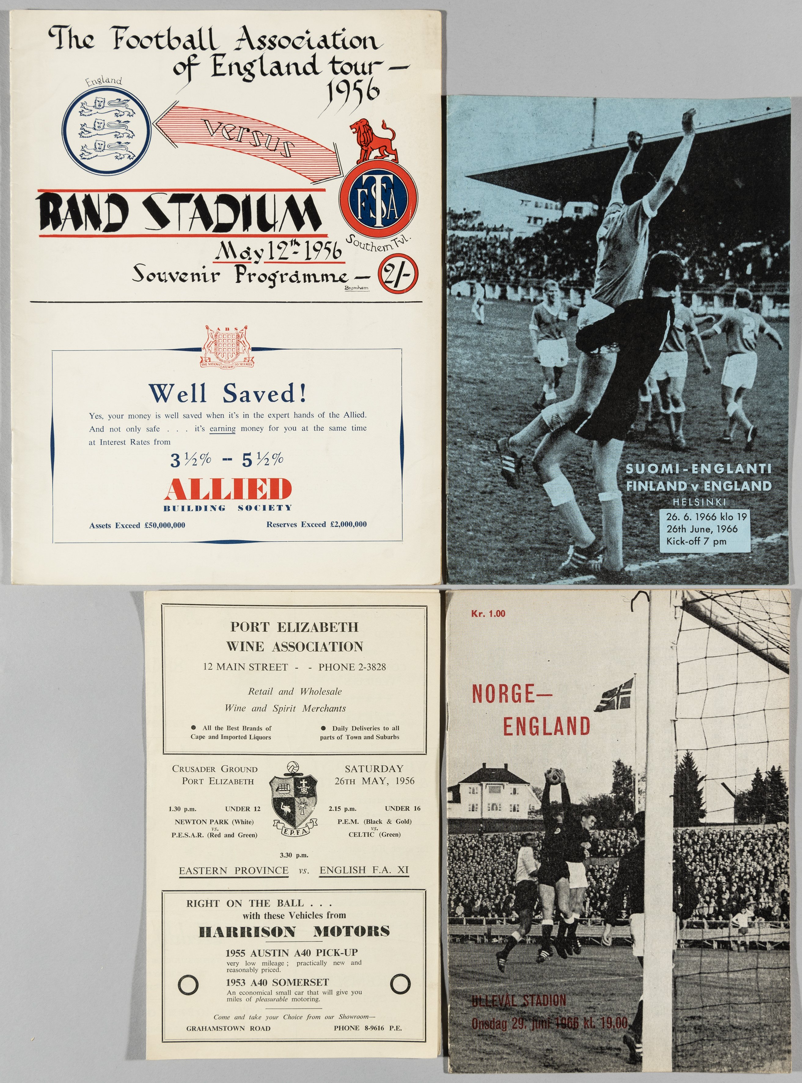 Two pre-World Cup England 1966 programmes, comprising v Finland played in Helsinki on 26th June 1966, 16-page blue programme and v Norway played in Onsdag on 29th June 1966, 28-page programme; sold together with a Football Association of England tour 1956 v Southern Transvaal souvenir programme played on 12th May, 20-page with cover and a English FA XI v Eastern Province programme, played at Crusader ground Port Elizabeth on 26th May 1956, 2-page, (4) Each in fair to good condition, with little wear, minor marks