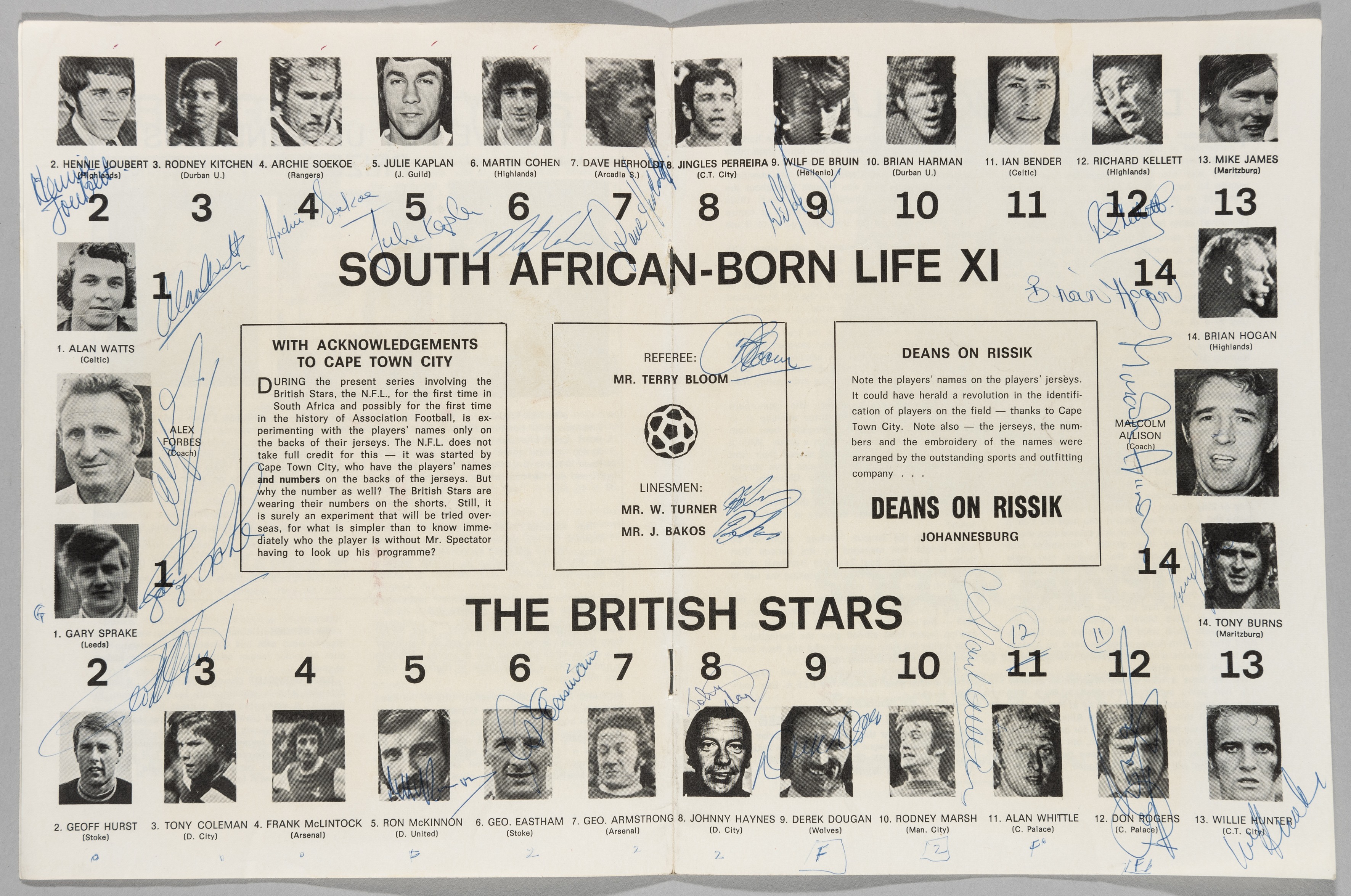 Rare signed British Stars v the South Africa Born Life XI football programme, played at Rand Stadium on 30th June 1973, 12-page programme with centre team line-up page featuring player profile images and singed by approx. 24 players and match officials, signed in blue ink, including Terry Bloom (referee), W Turner and J Bakos (linesmen), Malcolm Allison (coach), Alex Forbes (coach), Hennie Joubert, Gary Sprake, Julie Kaplan, Brian Hogan, Willie Hunter, and others Condition is fair to good with minor stains and marks