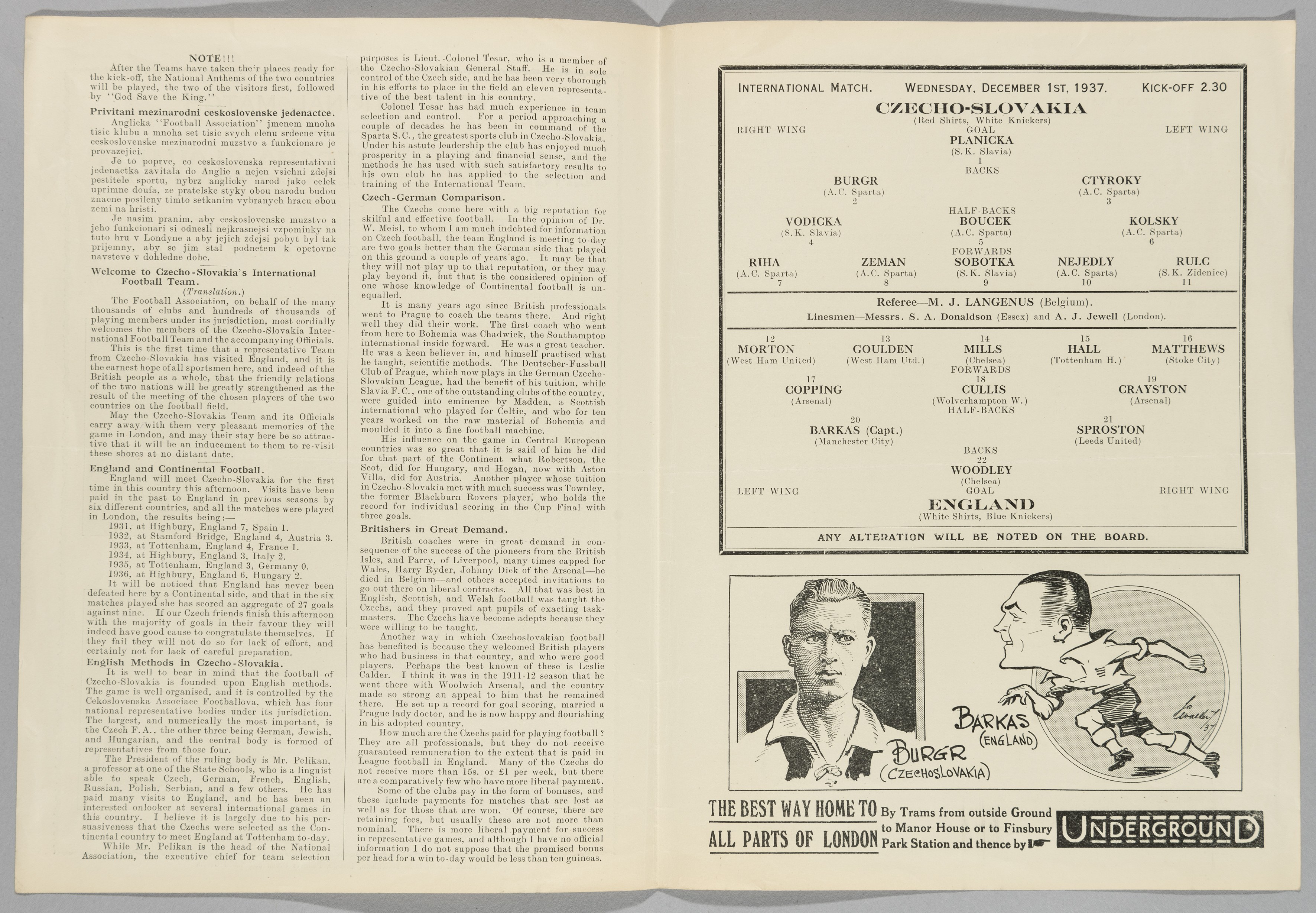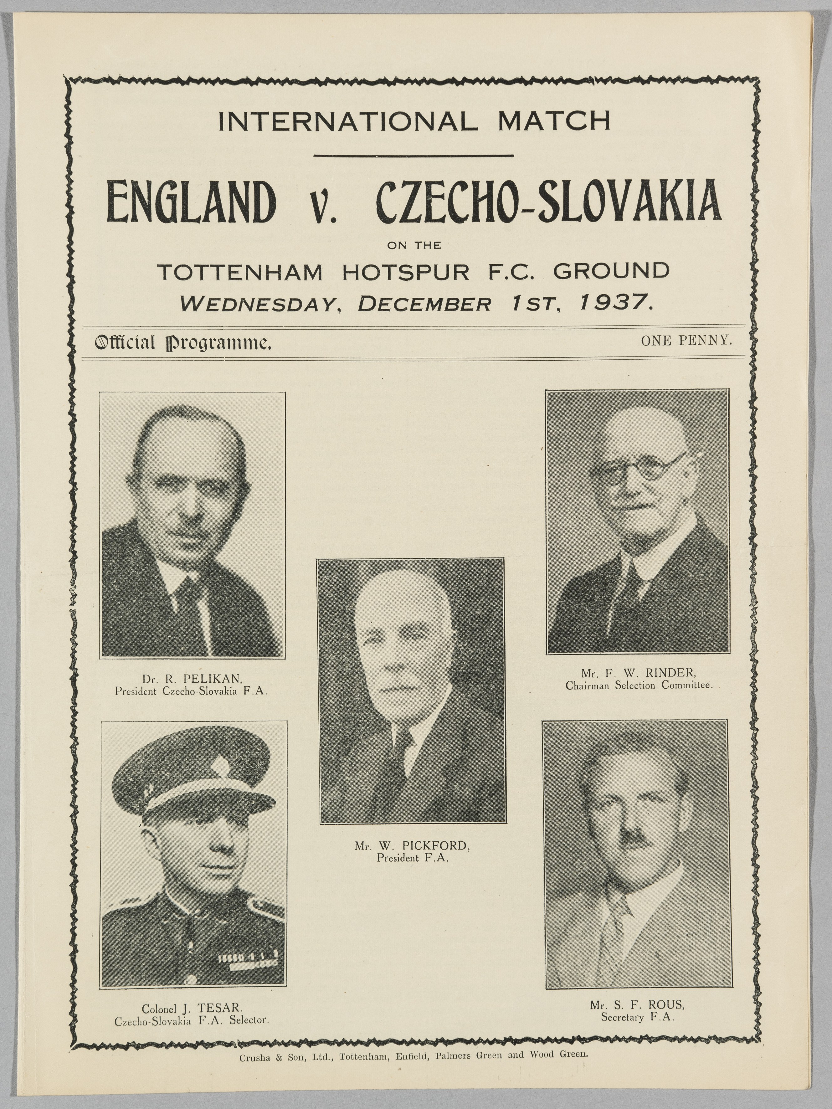 England v Czechoslovakia international match programme, played at Tottenham Hotspur on 1st December 1937, two-page programme with team line-up on cen
