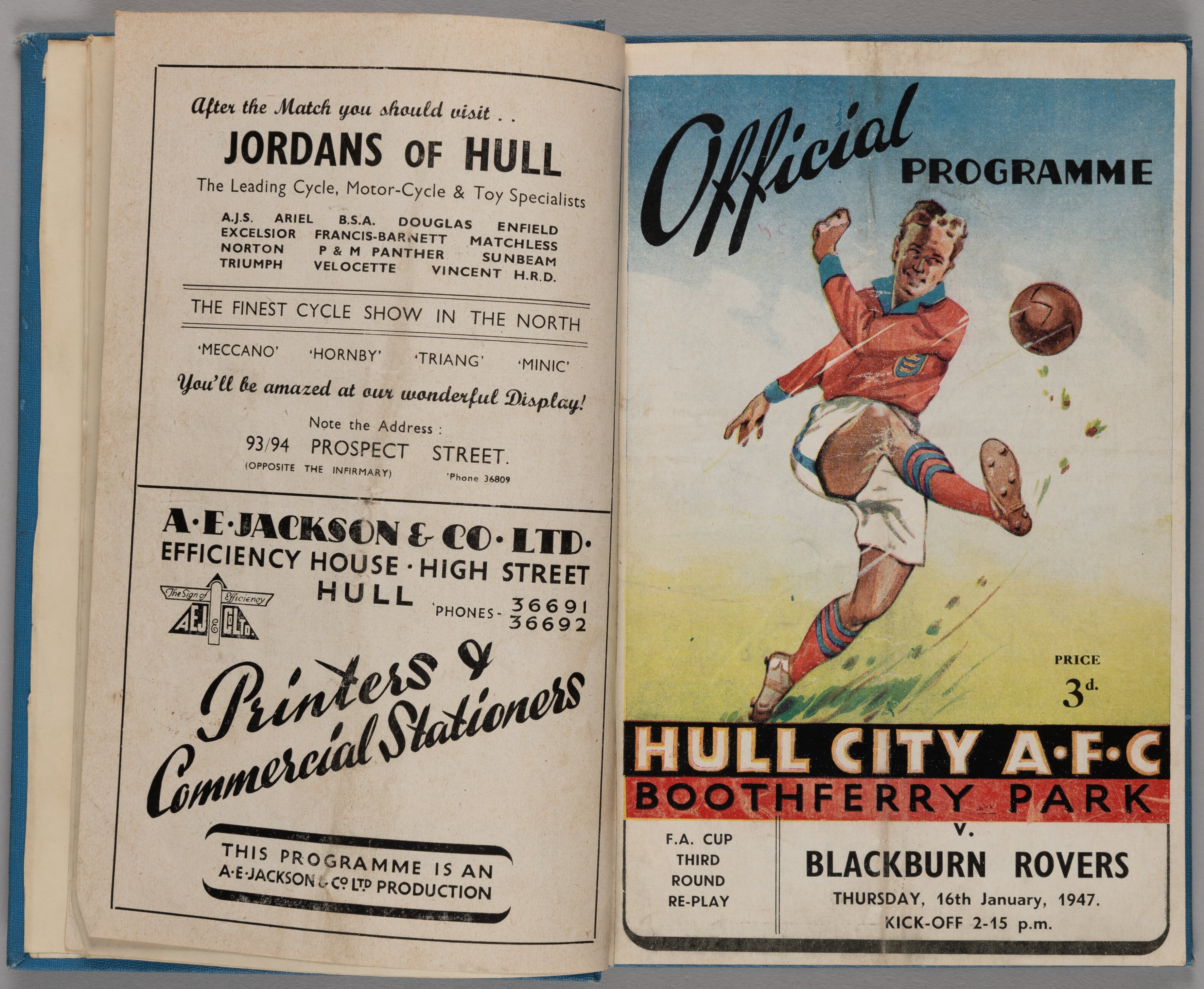 An unusual bound volume of Hull City match programmes, 1946-47 to 1949-50 season comprising: Fulham, Friendly, 25/1/47; Blackburn Rovers, F.A.Cup; 3rd round, replay; Accrington Stanley, 26/4/47; Bolton Wanderers, 3/5/47, Tranmere Rovers, 10/5/47; Middlesbrough, F.A.Cup 3rd round, 10/1/48; Rotherham United, 17/1/48; Stockport County, 31/1/48; Barrow, 12/2/48; Barrow, 15/1/49; Hartlepools United, 5/3/49; Chester, 2/4/49; Gateshead, 15/4/49; Stockport County, 30/4/49; Blackburn Rovers, 1/9/49; Plymouth Argyle, 17/9/49; Grimsby Town, 1/10/49; Barnsley, 26/11/49; and Brentford, 27/12/49, all bound in one volume (19) Some programmes show signs of fold, some team pages with ink or pencil changes, early example with some cover creases