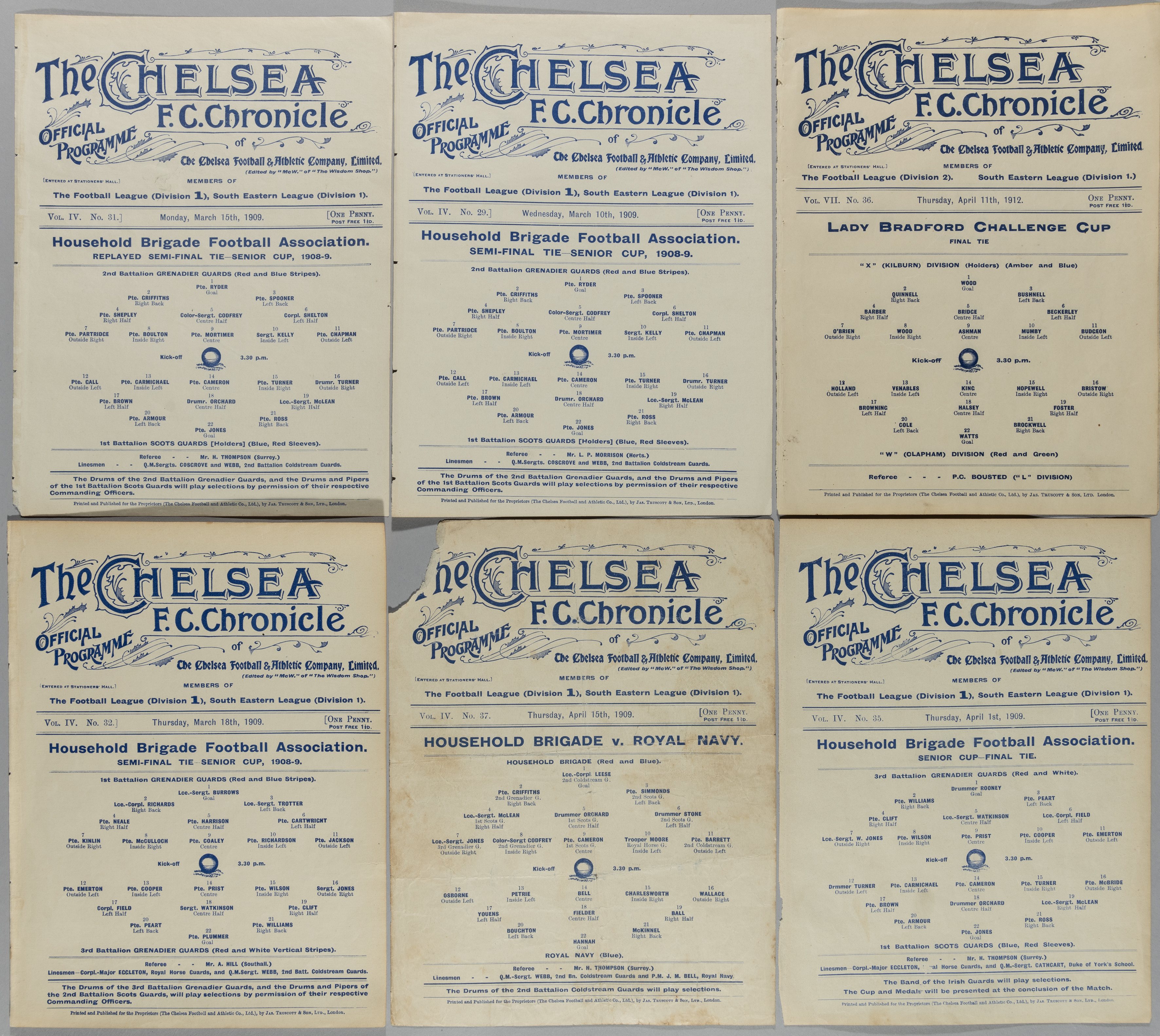 A collection of seven single-sheet Chelsea home programmes covering Military matches at Stamford Bridge, played on March 10th,15th,18th, April 1st and 15th all in 1909; plus April 11th and 26th both in 1912, all ex-bound volume