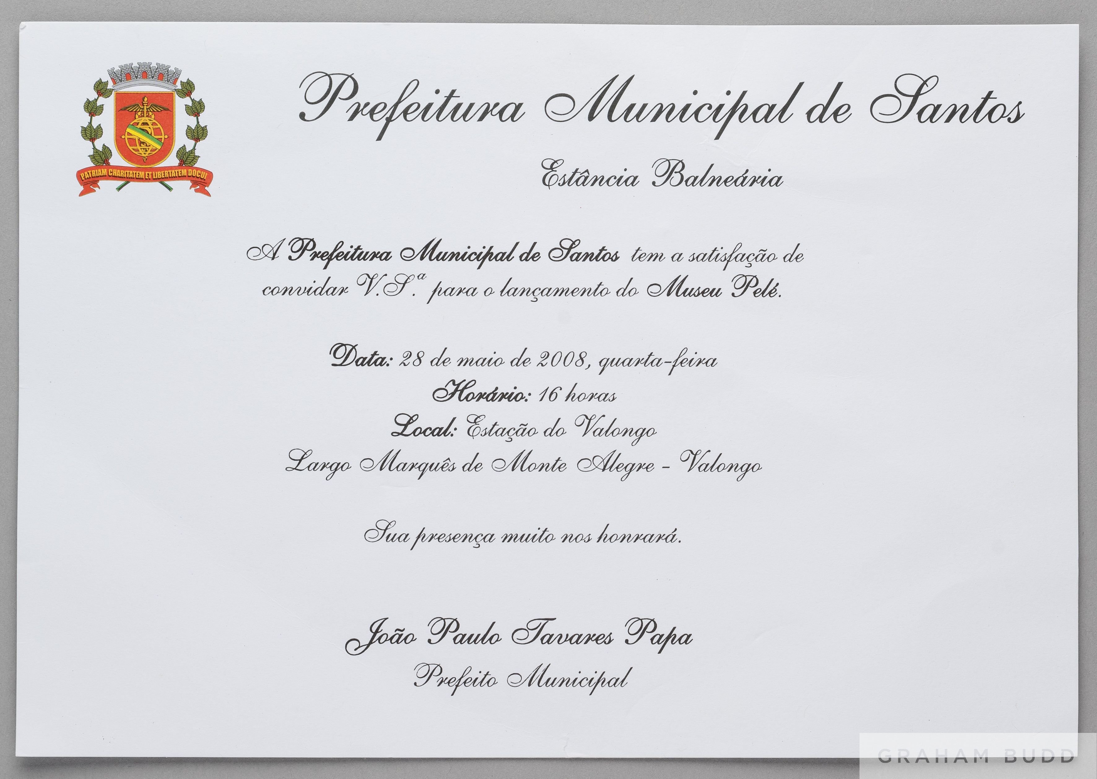 An invitation to the ground breaking for the Pelé Museum in Santos São Paulo, Brazil, presented to Pelé by the City of Santos. The event took place on May 28, 2008, at the site of the museum that would open in 2014, next to the Estacão do Valongo, 8.1/4 by 5 3/4in. PROVENANCE: The Pele Collection, Julien's Auctions, June 2016, Lot 1100