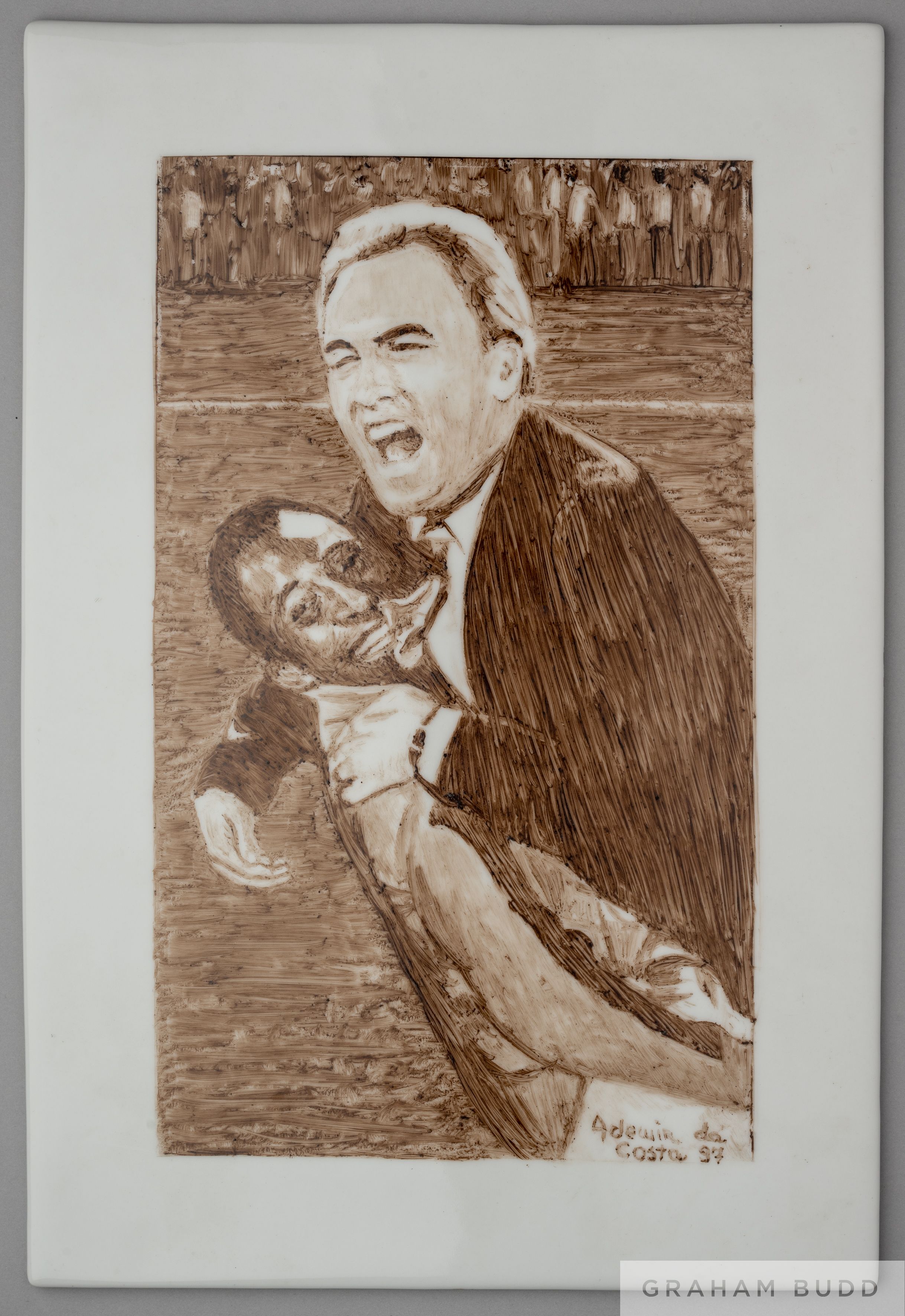 A ceramic tablet presented to Pelé on February 25, 1997 featuring an image of Pelé and his beloved coach and teacher, Julio Mazzei.,13 3/4 by 9 9/16 inches PROVENANCE: The Pele Collection, Julien's Auctions, June 2016, Lot 1410