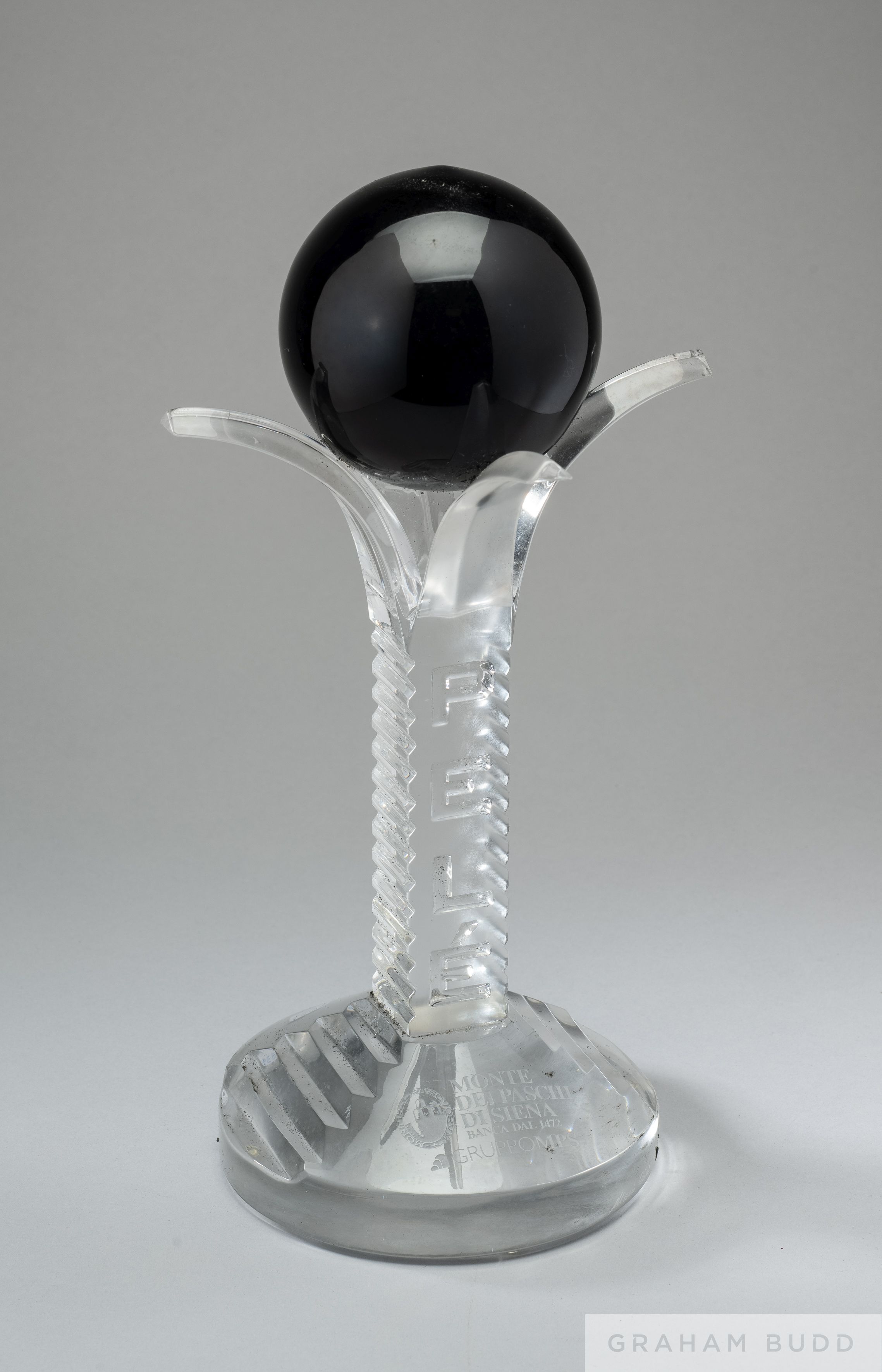 A lead crystal tribute trophy, mounted on a crystal base, presented to Pelé by Banca Monte dei Paschi di Siena in 2006 the year Pelé received the Artemio Franchi Award. The trophy features a black ball, an homage to Pelé’s nickname: the "Black Pearl" of Brazilian football. The stem features “PELÉ.” The base is inscribed “Banca Monte dei Paschi di Siena/Banco dal 1472/GRUPPOMPS.” Banca Monte dei Paschi is the oldest surviving bank in the world. The trophy is housed in a box from Mario Ciono and includes verification that the trophy is pure crystal with more than 24% lead, boxed, 15 by 8 3/4 by 8 inches PROVENANCE: The Pele Collection, Julien's Auctions, June 2016, Lot 298