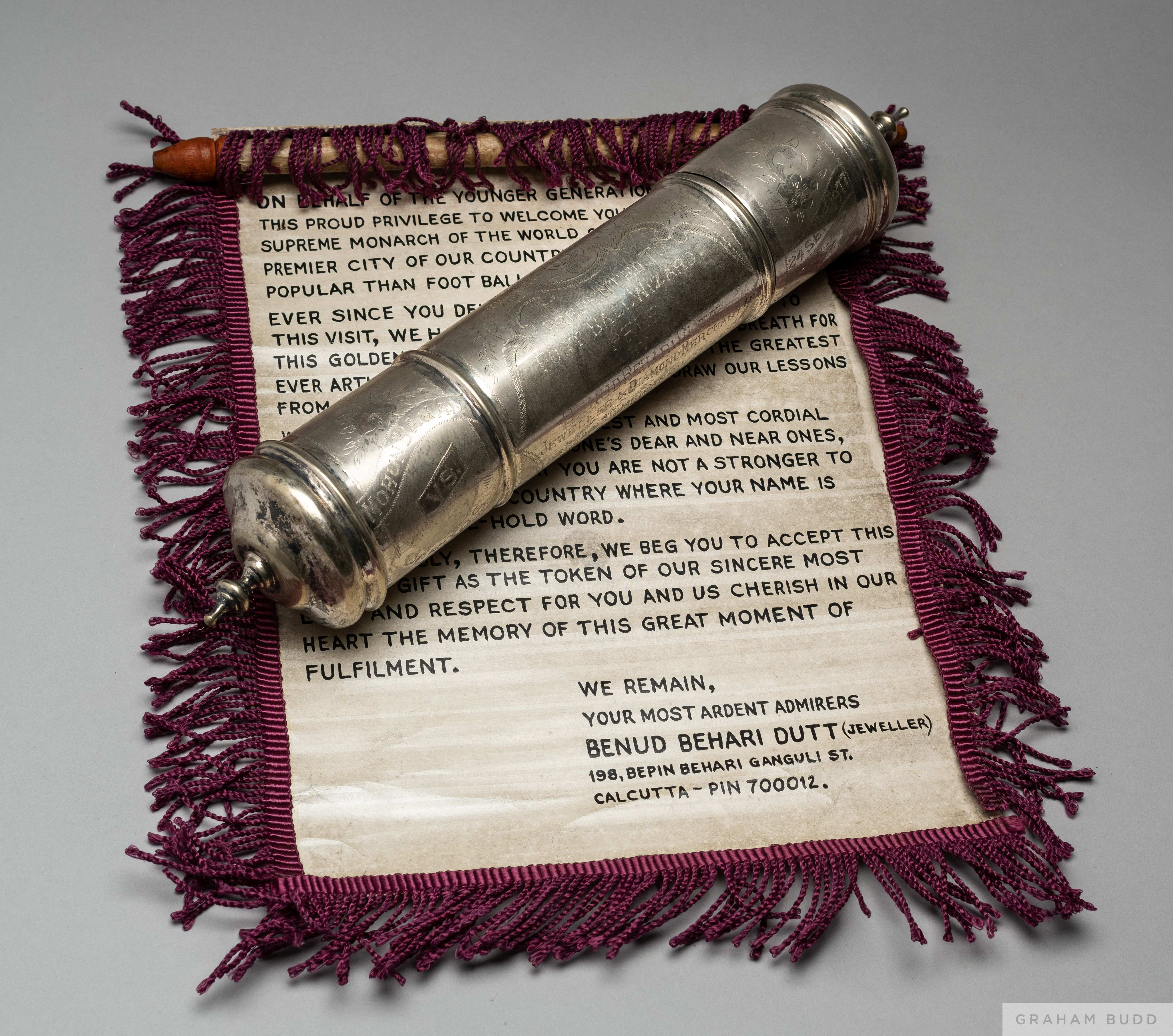 A tribute presented to Pelé composed of a cylindrical silverplated scroll box engraved with the following inscription: "Mohun Bagan vs. Cosmos - 24 Sept., 1977 - Presented to Football Wizard Pelé by Benud Behari Dutt, Jeweller & Diamond Merchant, 198 Bepin Behari Ganguli Street, Calcutta - 12 - Bow Bazar." The box contains a paper scroll with purple fringe and a handpainted inscription. Pelé's New York Cosmos team played a much anticipated international friendly match against Mohun Bagan on this date. The teams played to a 2-2 draw, 15 1/2 by 3 by 3in. PROVENANCE: The Pele Collection, Julien's Auctions, June 2016, Lot 149