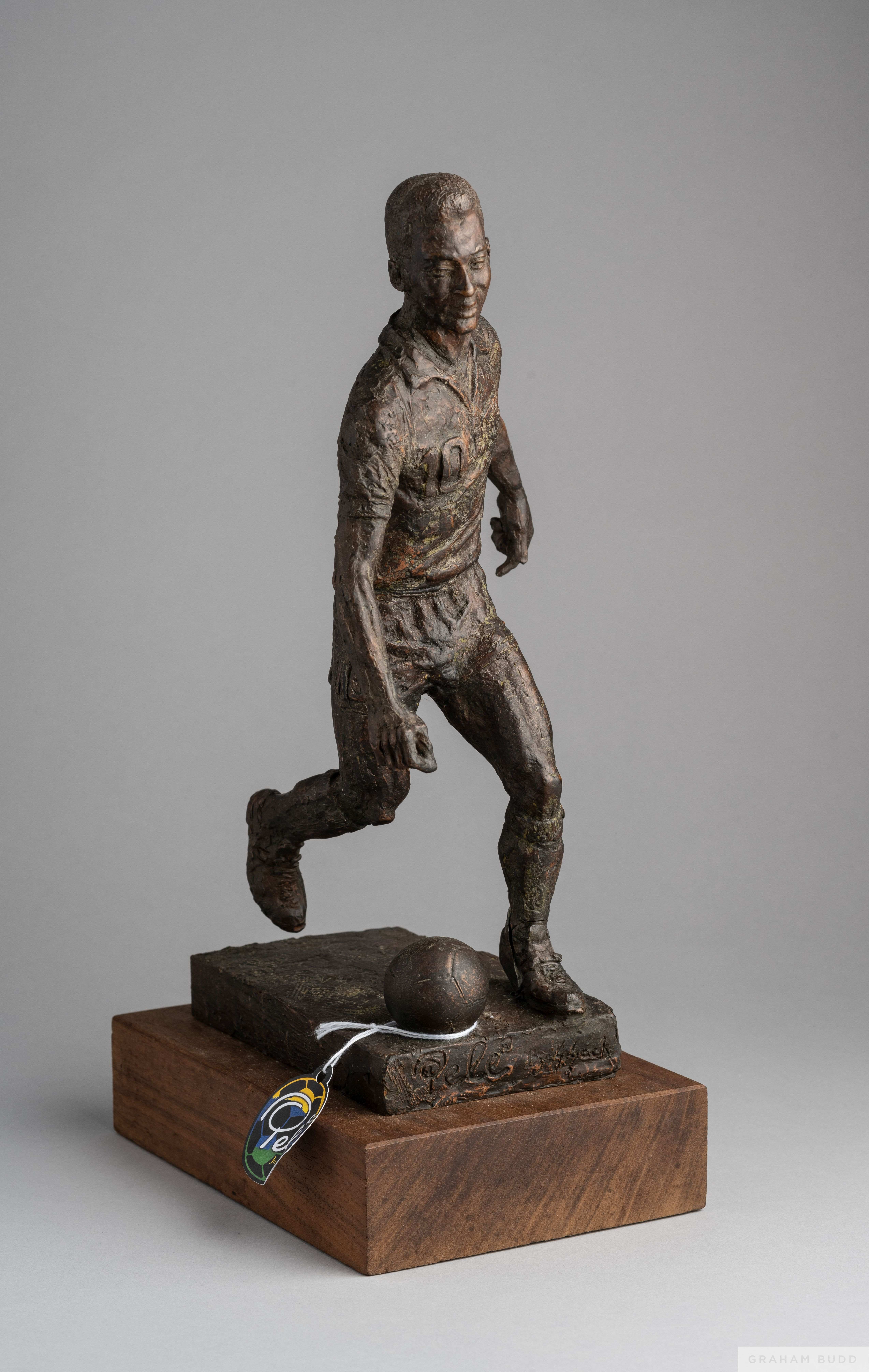 A bronze tone resin sculpture of Pelé kicking a soccer ball and wearing his No.10 shirt the sculpture is mounted on a wood base, 14 by 8 5/16 by 8 5/16in. PROVENANCE: The Pele Collection, Julien's Auctions, June 2016, Lot 497