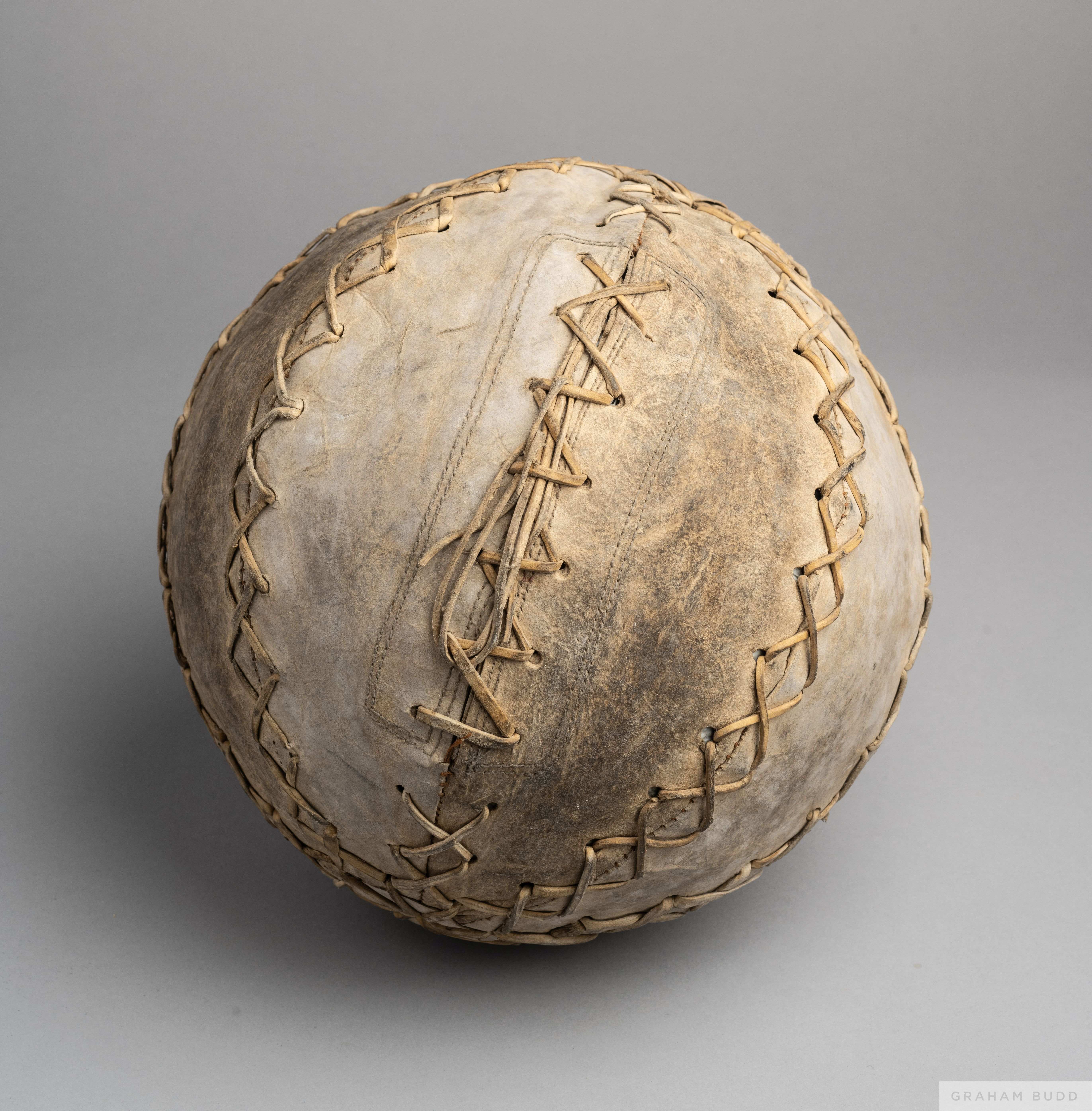 A hand stitched, rawhide cuju football presented to Pelé on a visit to China the football is housed in a red wooden box and sits on gold satin inside. This ball was used by Pelé in an event sponsored by MasterCard and the Beijing Tourist Administration “Soccer Pelé to Great Wall” and “Soccer-Cuju Play." On that visit, Pele played cuju, which China claims is the original, purest form of football. Accompanied by a colour photograph of Pelé at the event., Box, 10 1/2 by 10 1/2 by 11 inches PROVENANCE: The Pele Collection, Julien's Auctions, June 2016, Lot 556
