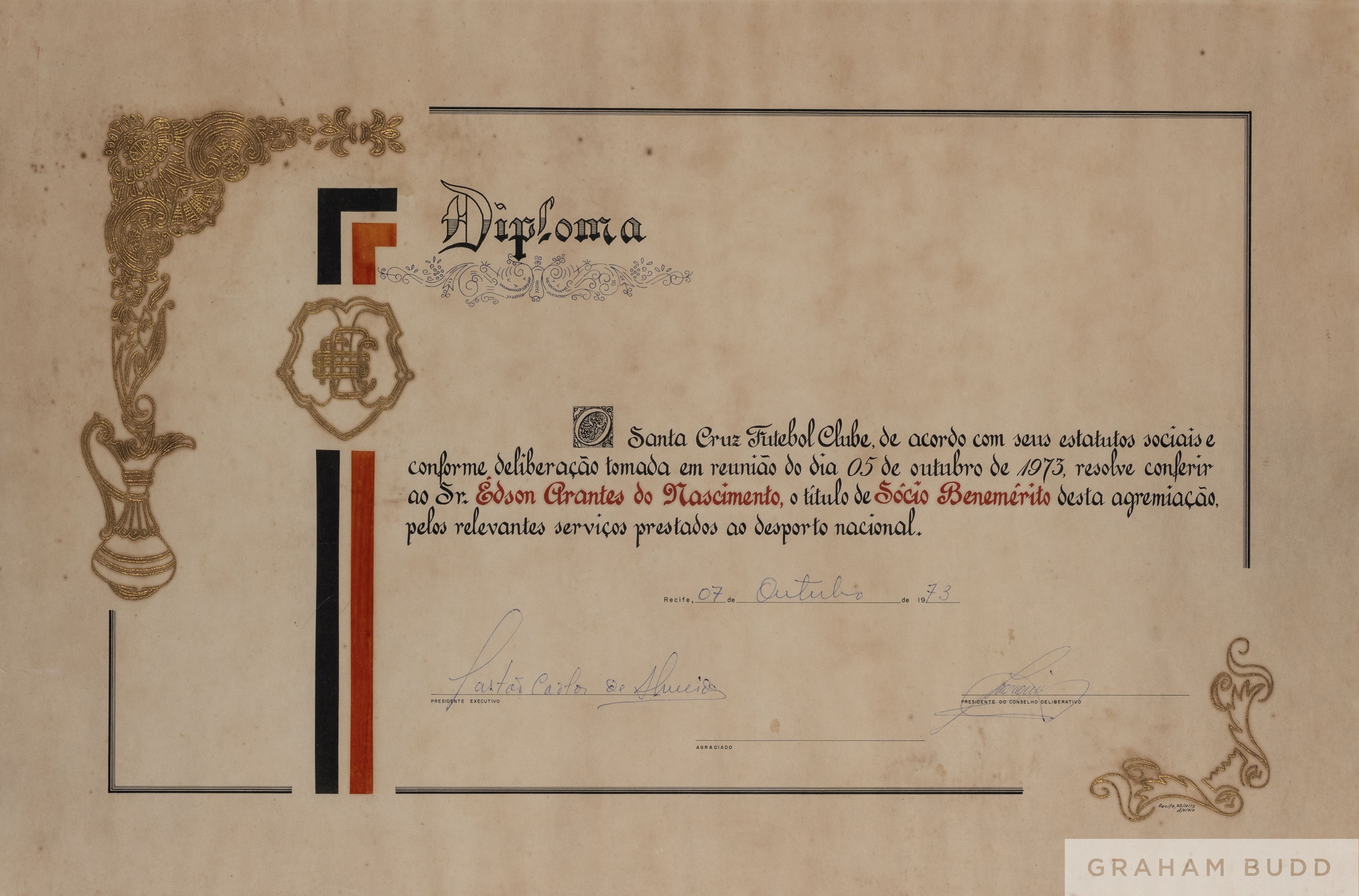 A "Diploma" certificate presented to Pelé on October 7, 1973, by the Brazilian football team Santa Cruz Futebol Clube, bestowing the title of honorary team member. Presented to "Edson Arantes do Nascimento," the certificate features a gold coloured Santa Cruz FC emblem. Pelé's Santos FC team played a Campeonato Brasileiro match versus Santa Cruz FC on this date, with Santa Cruz winning the match 3-2. Framed.28 1/4 by 20 1/4 inches, overall. PROVENANCE: The Pele Collection, Julien's Auctions, June 2016 Lot No.736