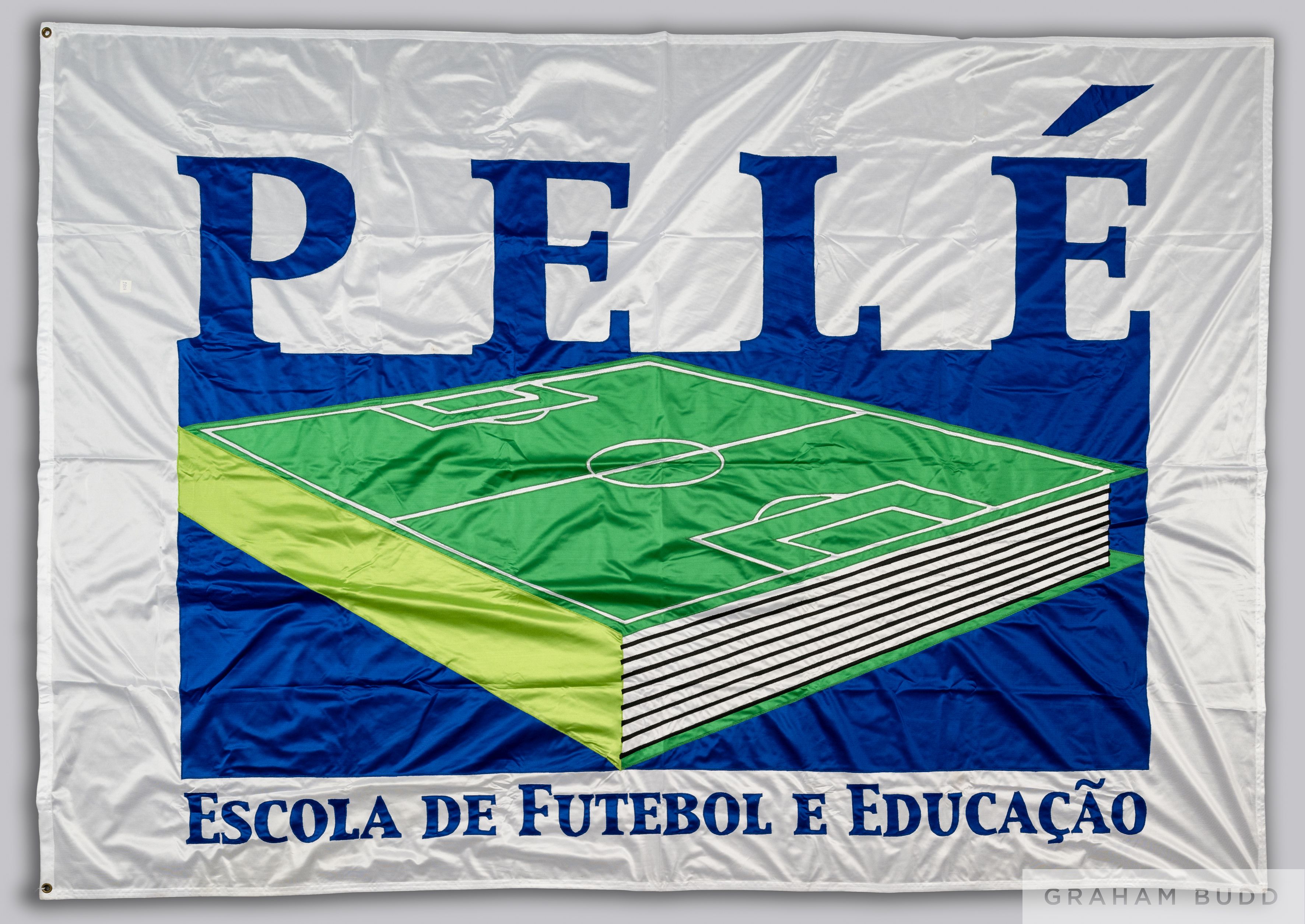 An official white and blue nylon flag given to Pelé by the Pelé Escola de Futebol e Educação [Pelé School of Football and Education],103 1/2 by 71 inches PROVENACE: The Pele Collection, Julien's Auctions, June 2016, Lot 1114