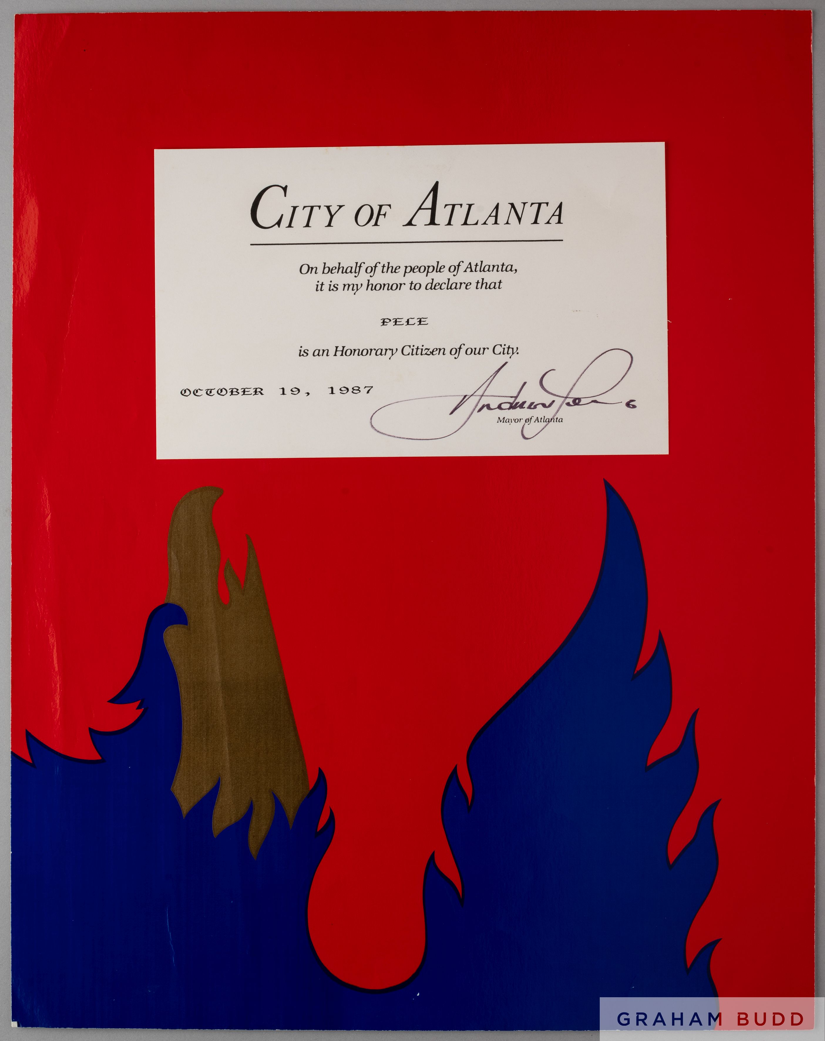 An honorary citizen certificate presented to Pelé in 1987 by the city of Atlanta, Georgia. Pelé was in Atlanta on October 19 to present Ford Foundation/Pelé tuition awards to 10 high school seniors. An inset white panel has lettering that reads "City of Atlanta/ On behalf of the people of Atlanta,/ it is my honour to declare that/ Pele/ is an Honorary Citizen of our City." The certificate is dated October 19, 1987, and signed in black marker by then Mayor of Atlanta Andrew Young. 4 by 11 inches, overall. PROVENANCE: The Pele Collection, Julien's Auctions, June 2016 Lot 365