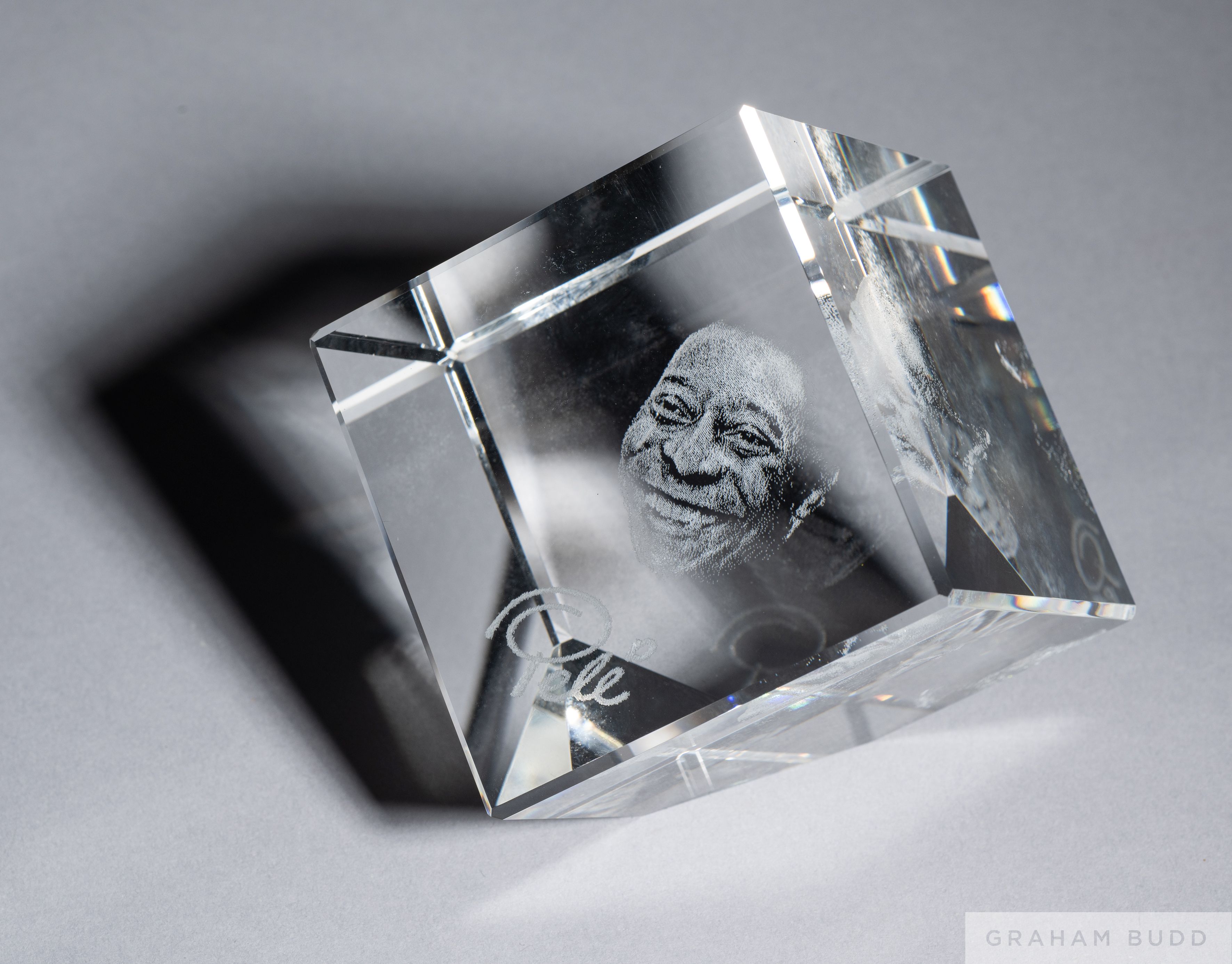A crystal memento owned by Pelé featuring an internal laser-etched portrait of himself above the name Pelé. Includes a signed certificate of authenticity from Crystalix, numbered 001 and dated November 14, 2003. Housed in original presentation box, 5 by 4 1/8 by 5 1/8 inches. PROVENANCE: The Pele Collection, Julien's Auctions, June 2016, Lot 316