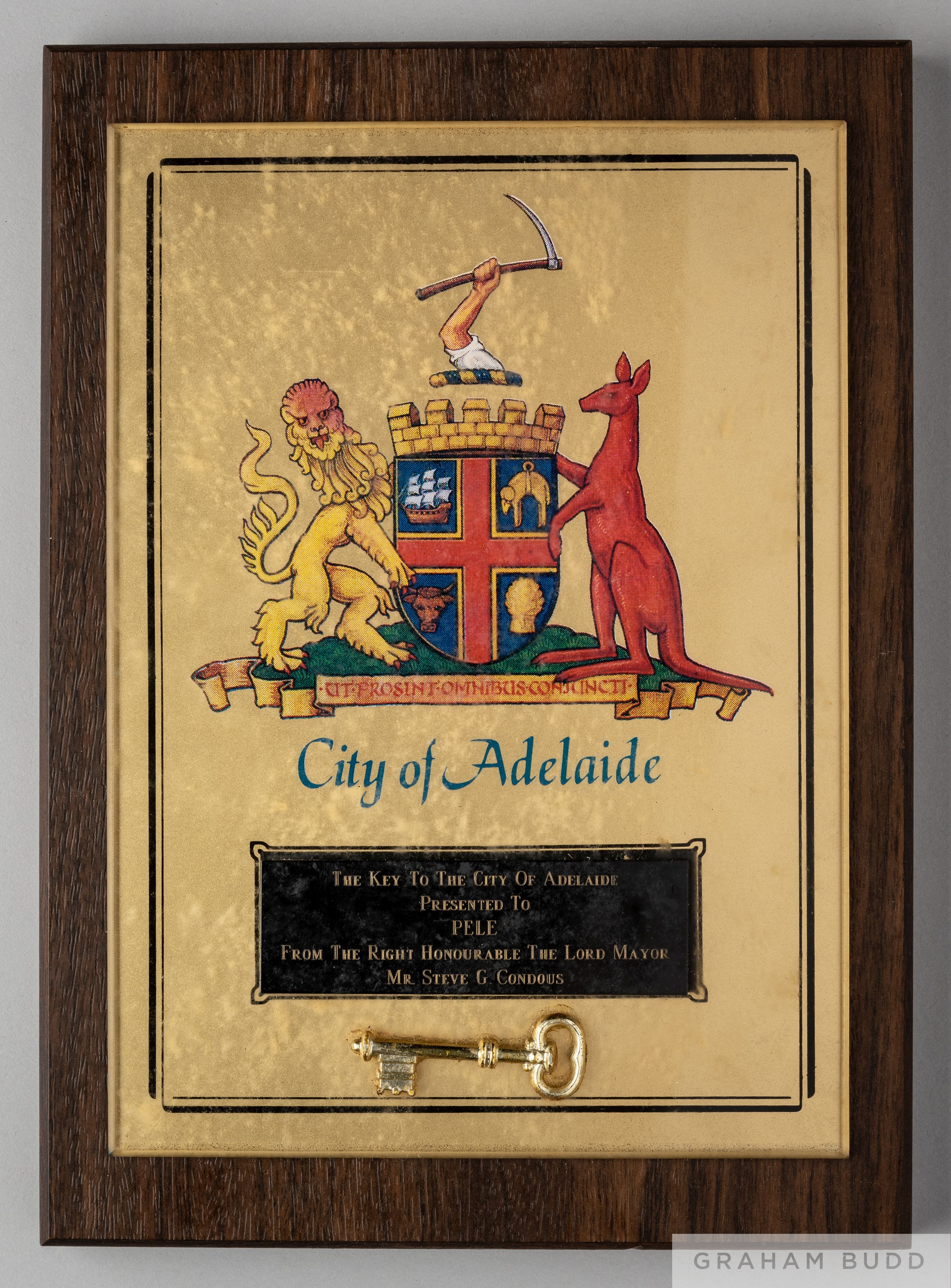 An Adelaide, Australia, Key to the City plaque presented to Pelé on July 5, 1988. The gold tone plaque is affixed to a wood base. The plaque features