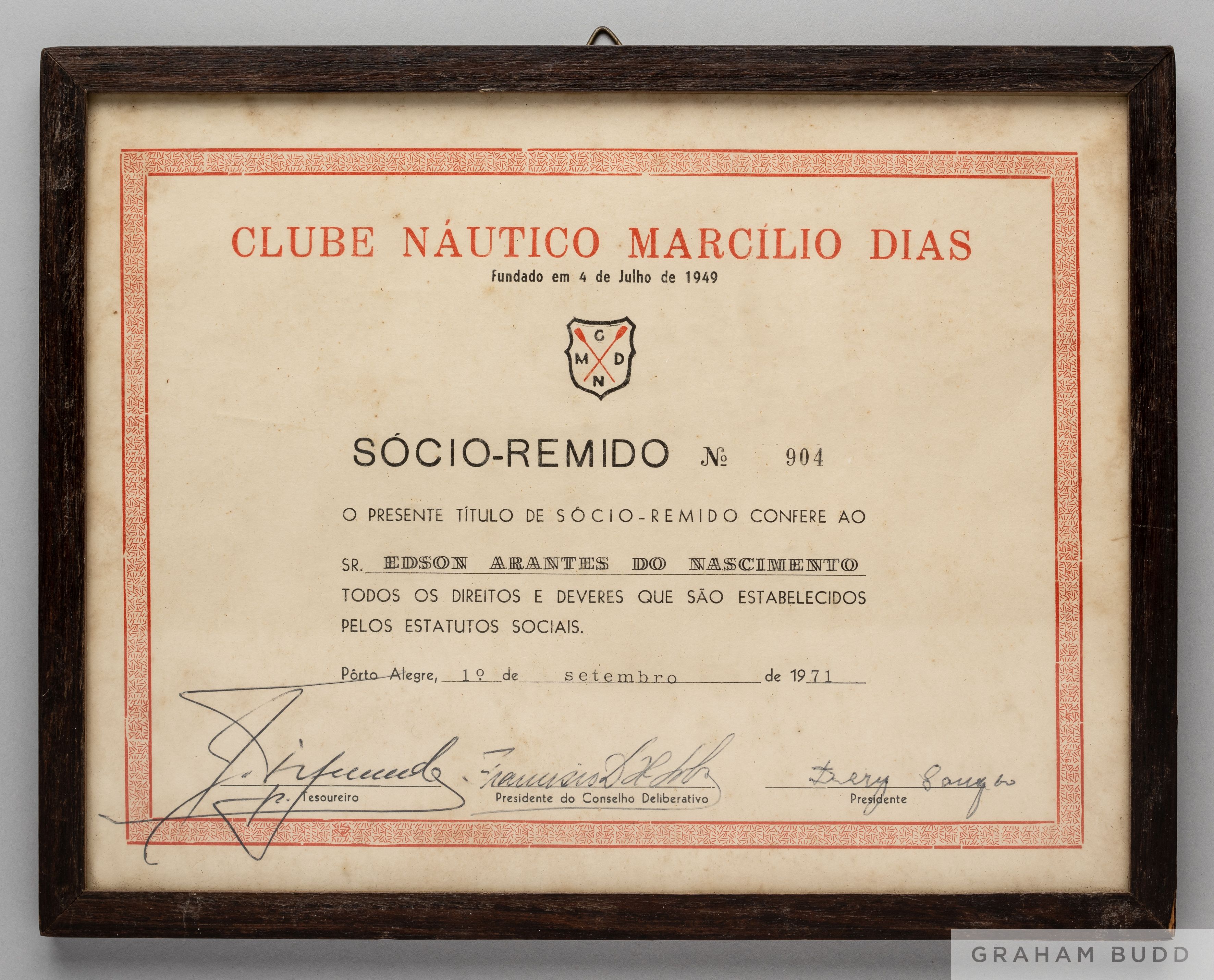 A framed paper certificate presented to Pelé on September 1, 1971, By the Clube Náutico Marcílio Dias, generally known as Marcílio Dias, a Brazilian football club from Itajaí, Santa Catarina,10 by 7 13/16 inches. PROVENANCE: The Pele Collection, Julien's Auctions, June 2016, Lot 187