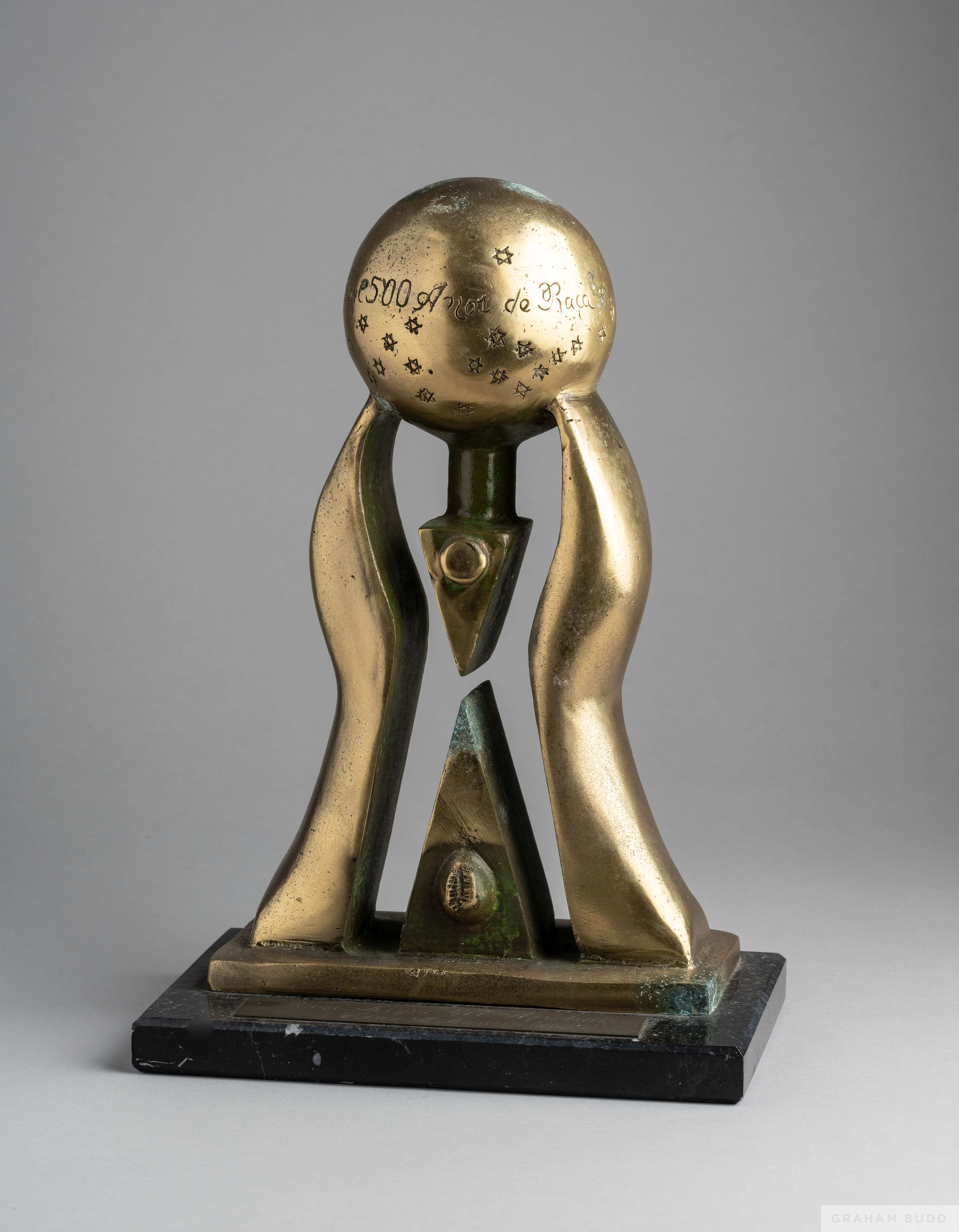 A trophy presented to Pelé composed of a marble base mounted by a stylized pair of hands holding aloft a globe that is inscribed "Brasil e 500 Anos de