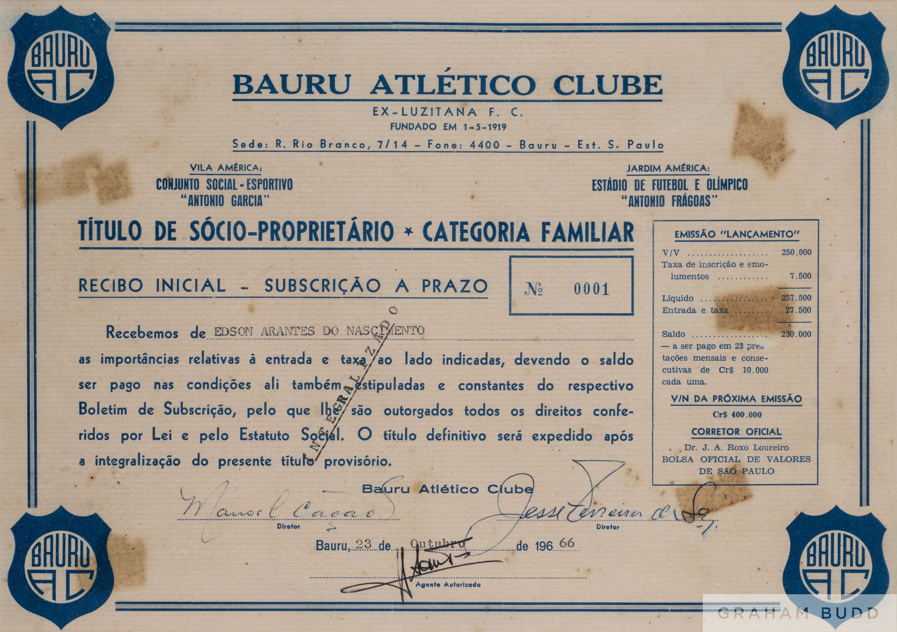 A framed title of business specifying Pelé as part owner of the Bauru Athletic Club. Dated October 23, 1966, 20 1/2 by 17 1/8 inches, overall PROVENANCE: The Pele Collection, Julien's Auctions, June 2016, Lot No.769