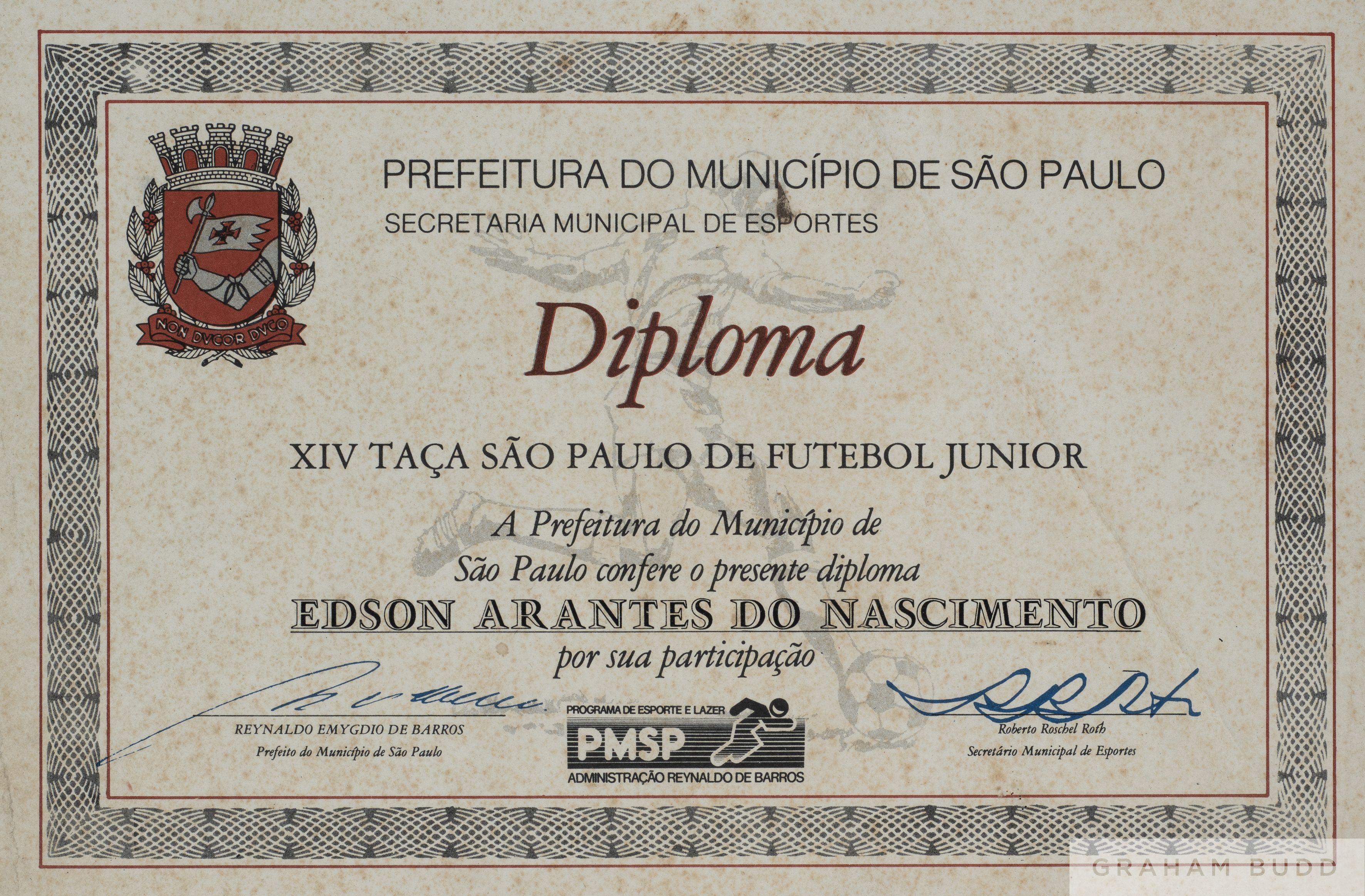 A framed paper certificate presented to Pelé by the city of São Paulo, Brazil, and the São Paulo municipal secretary of sports for his participation in the 14th Taça São Paulo Junior Football Cup. 12 by 8 1/2 inches, overall PROVENANCE: The Pele Collection, Julien's Auctions, June 2016, Lot No.1449