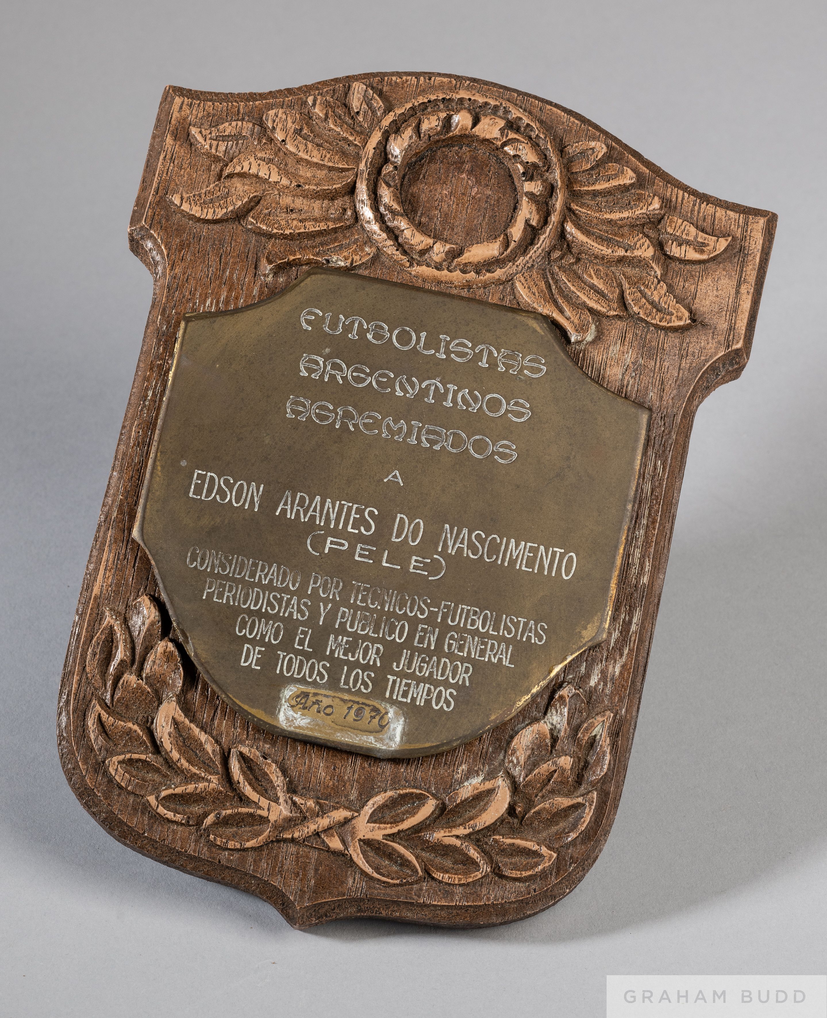 A gold tone base metal plaque, mounted on wood, presented to Pelé by the members of the Argentine Footballers Union. The plaque is inscribed (translated) "To Edson Arantes do Nascimento/(PELE)/ considered by the technical football journalists and the public in general as the greatest football player of all time/ 1973." 8 by 6 inches PROVENANCE: The Pele Collection, Julien's Auctions, June 2016, Lot No.722