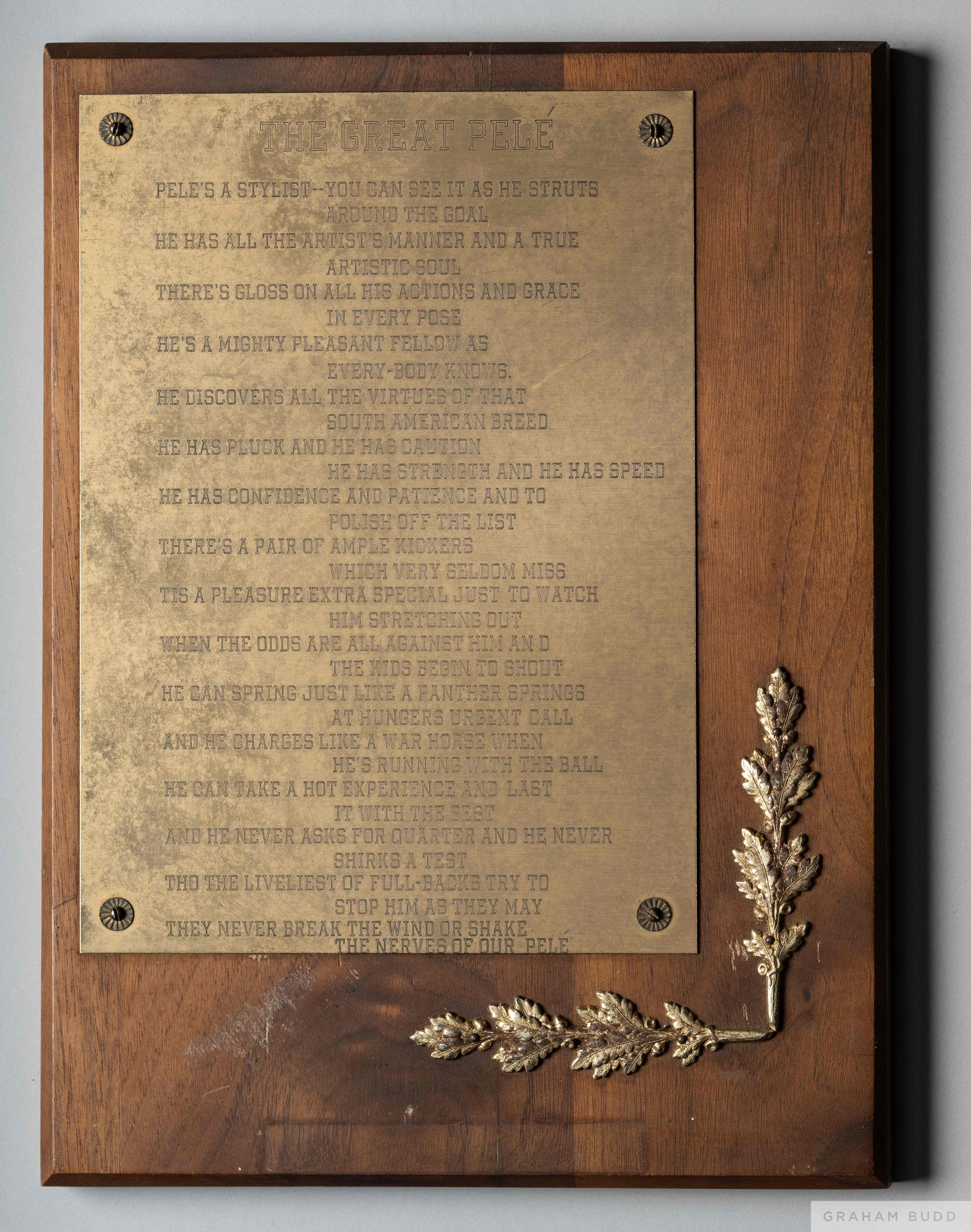 A gold tone engraved plaque owned by Pelé, mounted to a wood backing, featuring a poem titled "The Great Pelé."12 by 9 inches PROVENANCE: The Pele Collection, Julien's Auctions, June 2016. Lot No.653