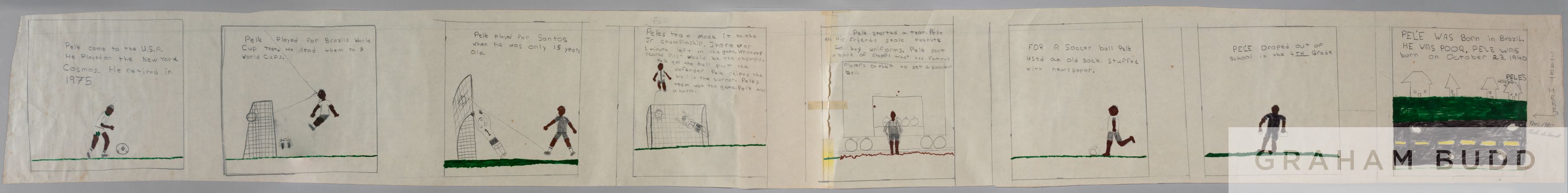 A tribute presented to Pelé composed of a long paper scroll created by a young child with hand drawn illustrations and text recounting highlights in the life of Pelé from his birth in 1940 to his retirement in 1975, the scroll is dated and signed "Nov. 1980, Rudi Schmoll."10 3/4 by 94 inches PROVENANCE: The Pele Collection, Julien's Auctions, June 2016, Lot No.119