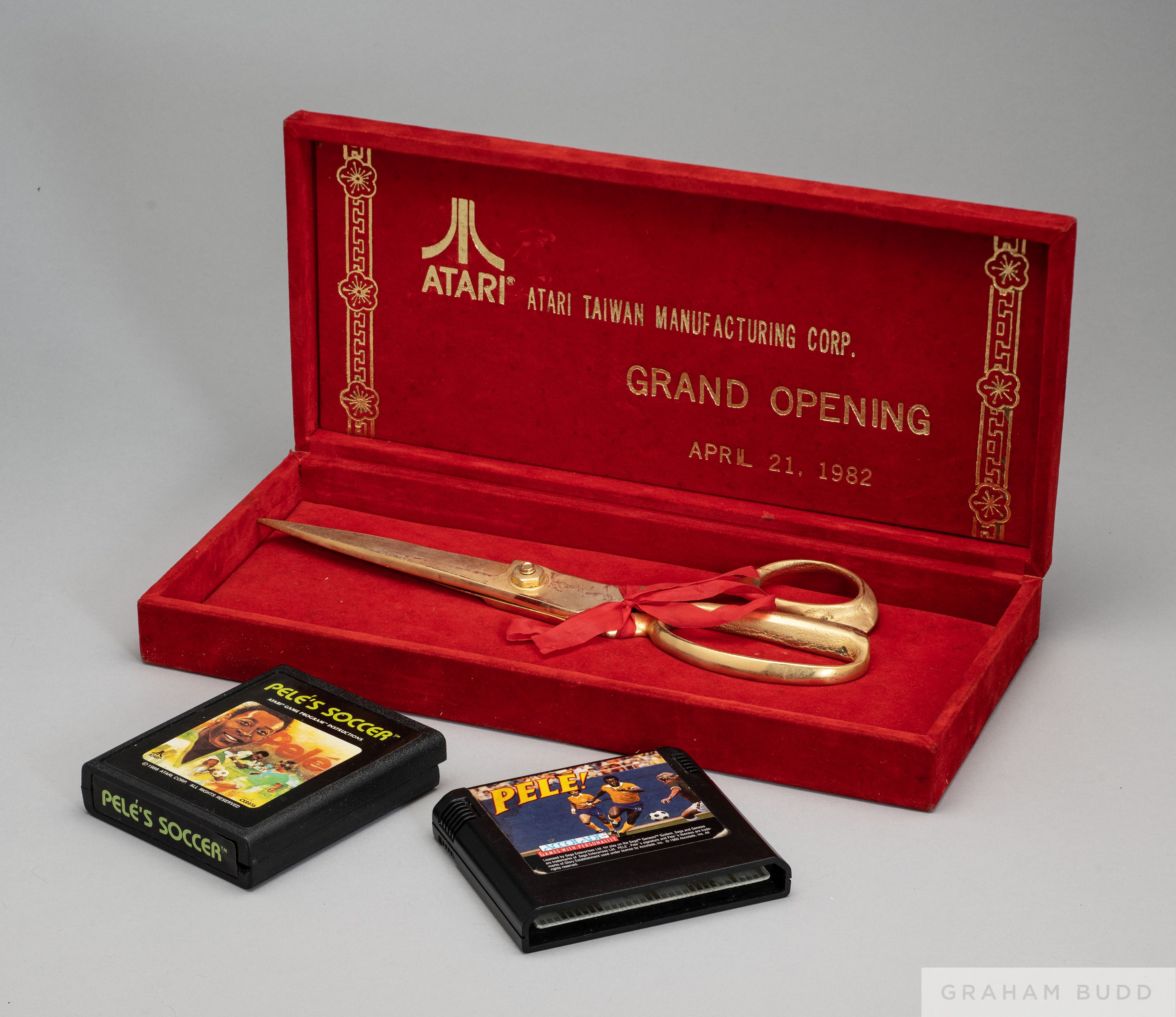 A pair of gold tone metal scissors presented to Pelé by Atari Manufacturing. Pelé used these scissors in the ribbon-cutting ceremony at the grand opening of Atari's manufacturing facility in Taiwan in 1982. The scissors are housed in a red velvet case that features "Atari Taiwan Manufacturing GRAND OPENING, April 21, 1982" stamped in gold on the outside and the inside cover. The scissors are accompanied by a pair of vintage video game cartridges owned by Pelé including the 1988 Atari game "Pelé's Soccer," and the 1993 SEGA Genesis game "Pelé" made by Accolade Inc. Case, 12 by 5 1/4 by 1 3/4 inches PROVENANCE: The Pele Collection, Julien's Auctions, June 2016, Lot No.669